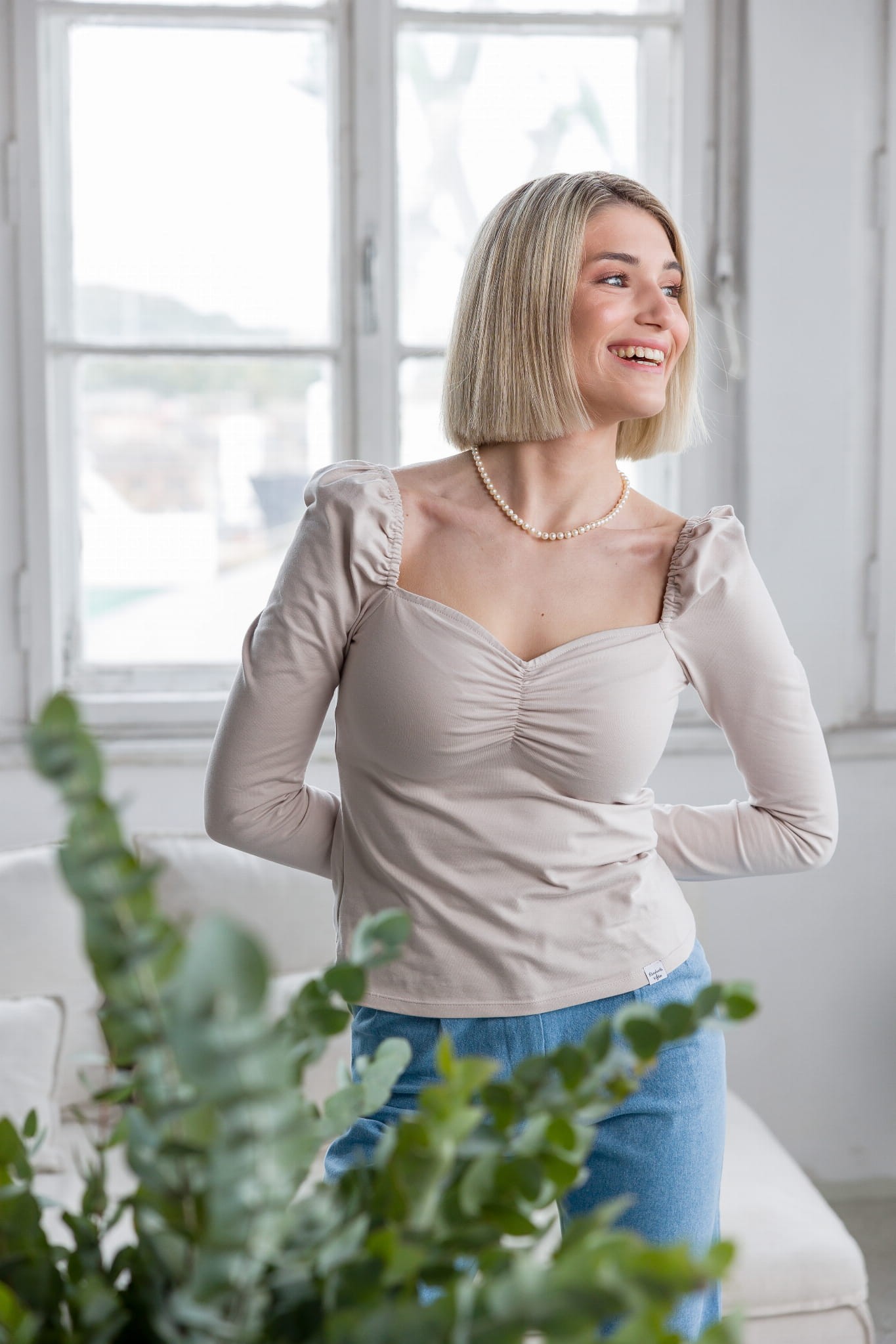 Taliowana bluzka z wiskozy z marszczonym dekoltem typu serce i długimi rękawkami na gumce, które idealnie sprawdzą się zarówno na co dzień, jak i od święta. Bluzka Aria jest doskonałym wyborem, gdy chcesz dodać stylizacji nutę romantyzmu.