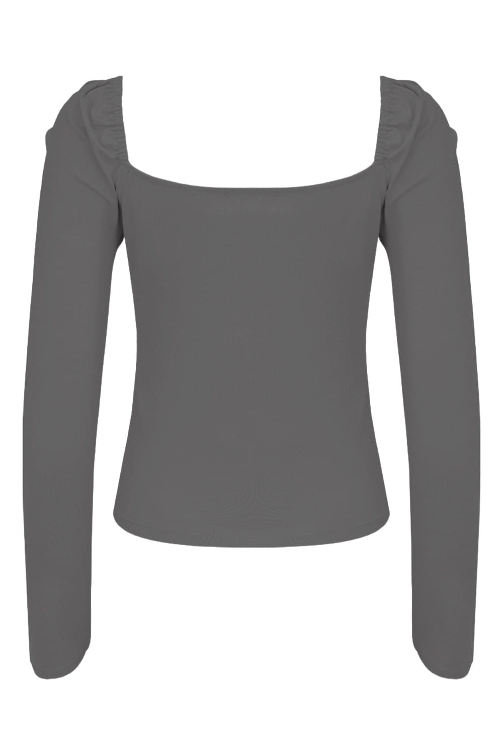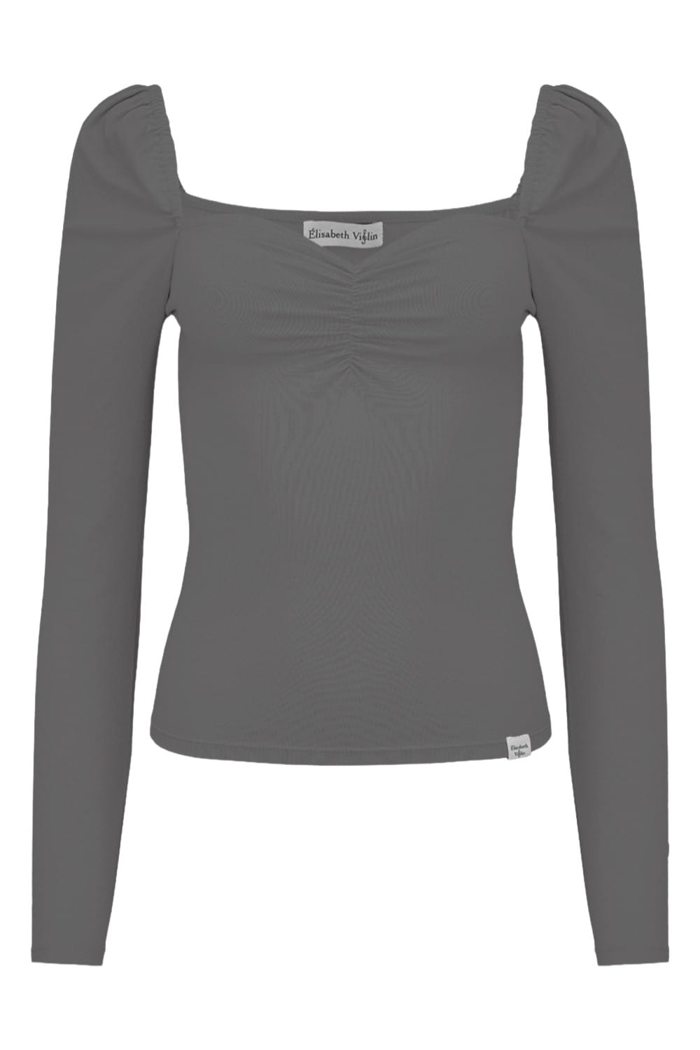 ARIA - Charcoal Gray - wiskozowa taliowana bluzka z marszczonym dekoltem serce i długimi rękawami na gumce