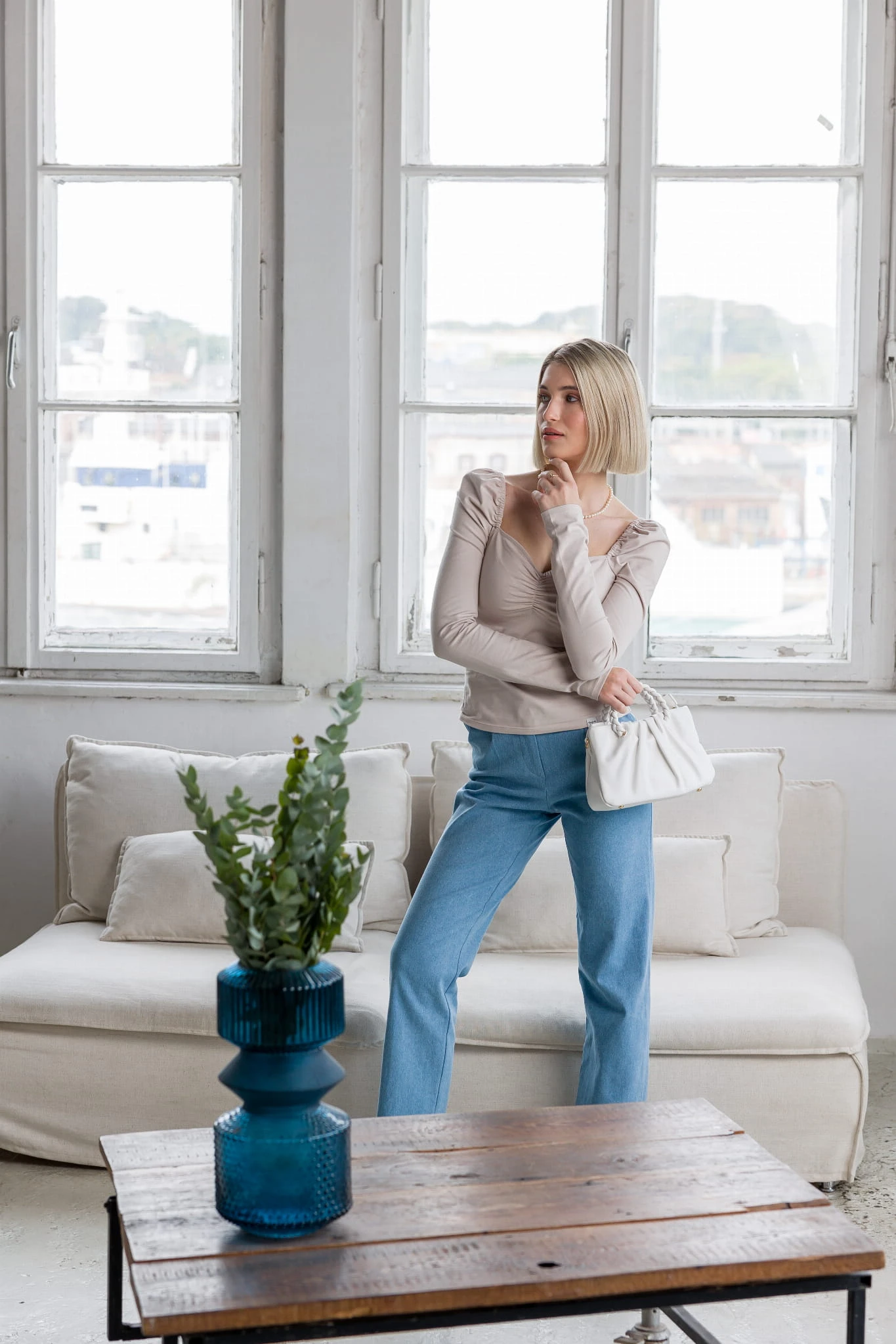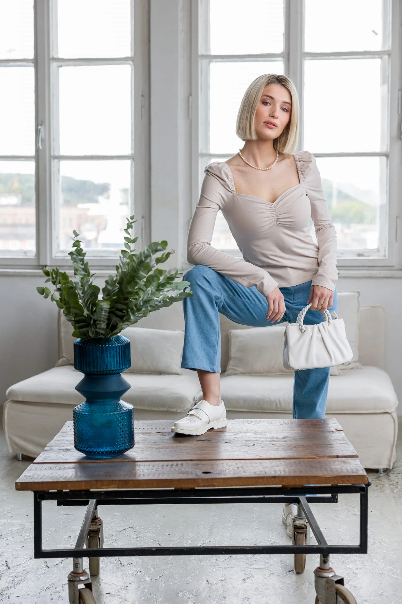 Modelka ma na sobie bluzkę z długim rękawem.