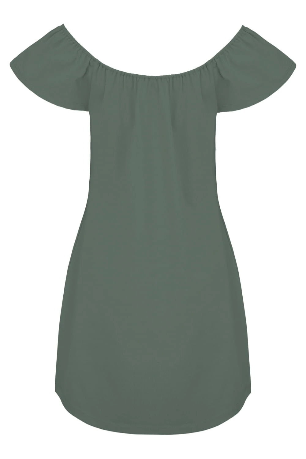 CORALIA - Balsam Green - wiskozowa sukienka przed kolano z odkrytymi ramionami i rękawami z falbanką