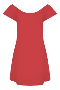 CORALIA - Ribbon Red - bambusowa sukienka przed kolano z odkrytymi ramionami i rękawami z falbanką