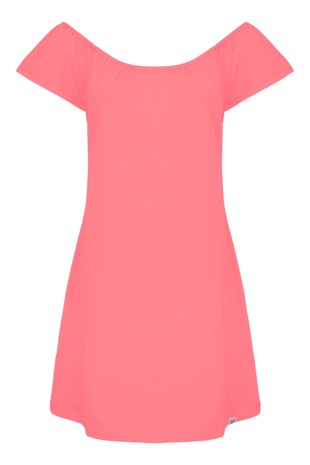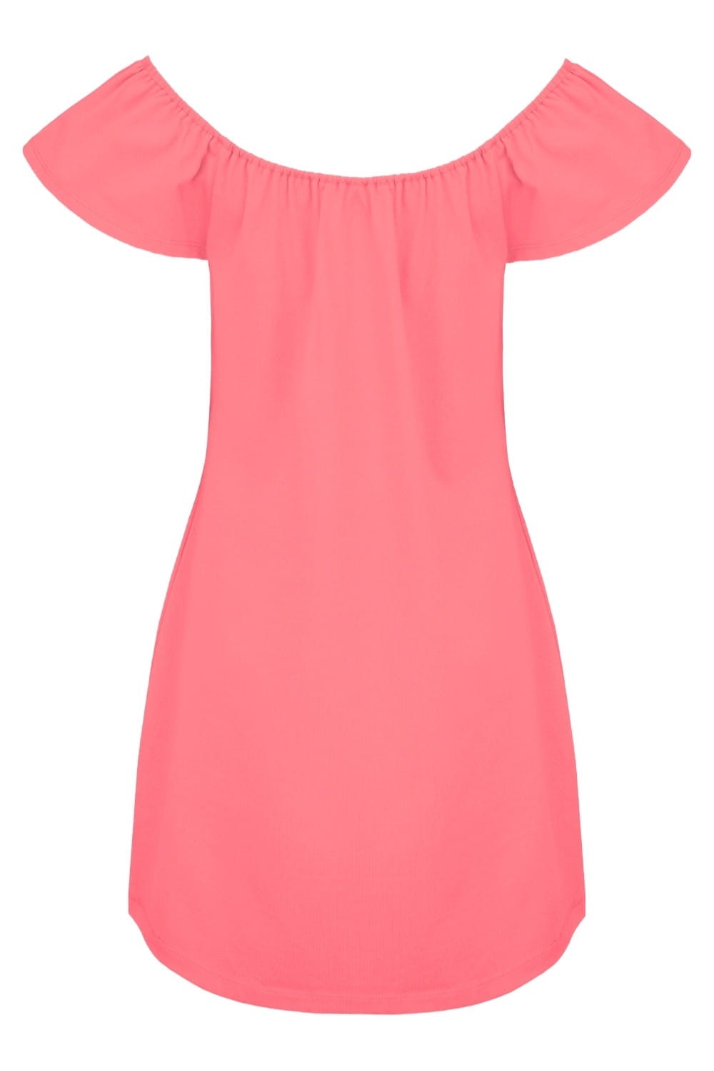 CORALIA - Sunkist Coral - bawełniana sukienka przed kolano z odkrytymi ramionami i rękawami z falbanką