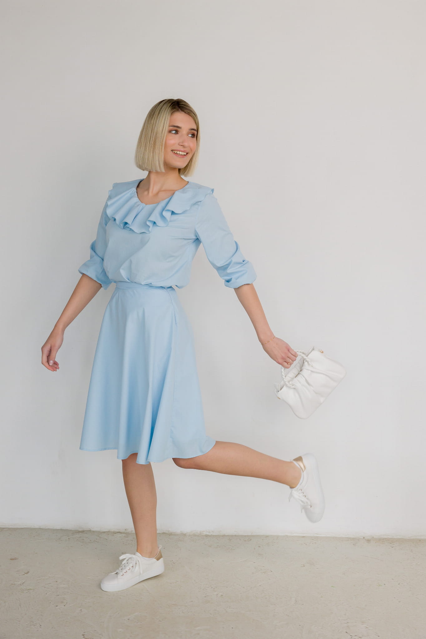 !!! WAŻNE - modelka ma na sobie spódniczkę wykonaną z innego materiału - gładkiej bawełny, który niebawem również pojawi się na stronie. Aby zobaczyć, jak wygląda struktura materiału "muślin bawełniany", przyjrzyj się pierwszemu zdjęciu.