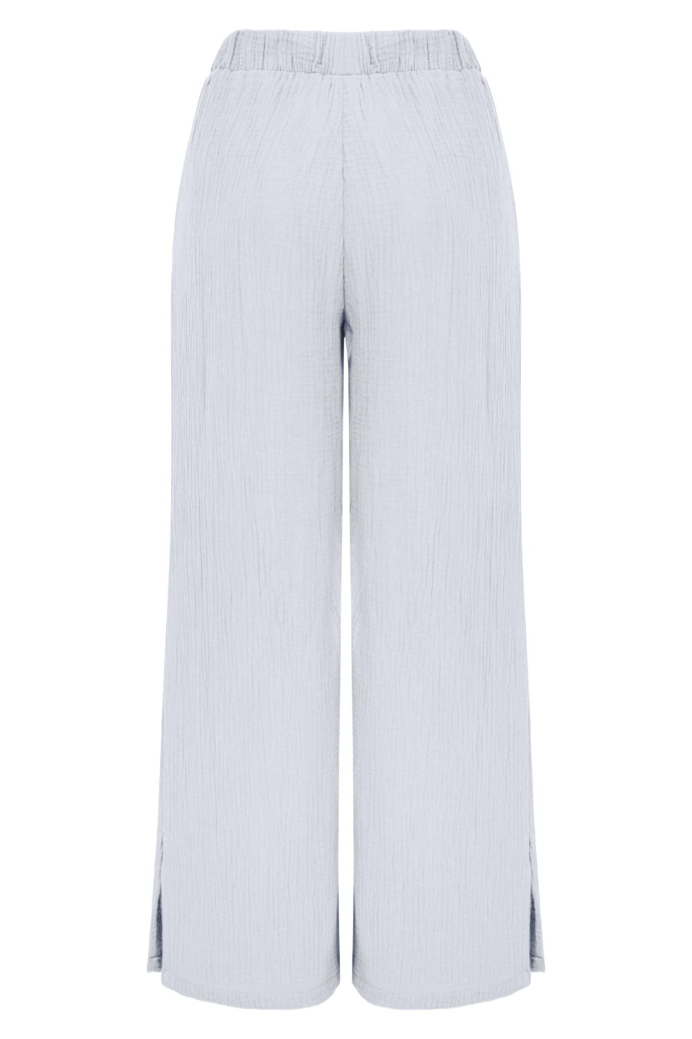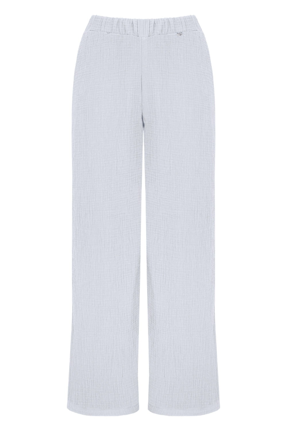 Uszyte z muślinu bawełnianego – oddychającego, miękkiego i przewiewnego materiału o naturalnej teksturze. Nasz muślin posiada certyfikat OEKO-TEX Standard 100, co gwarantuje bezpieczeństwo i najwyższą jakość. Materiał nie kurczy się po praniu, więc Twoje spodnie pozostaną w idealnym rozmiarze przez długi czas.