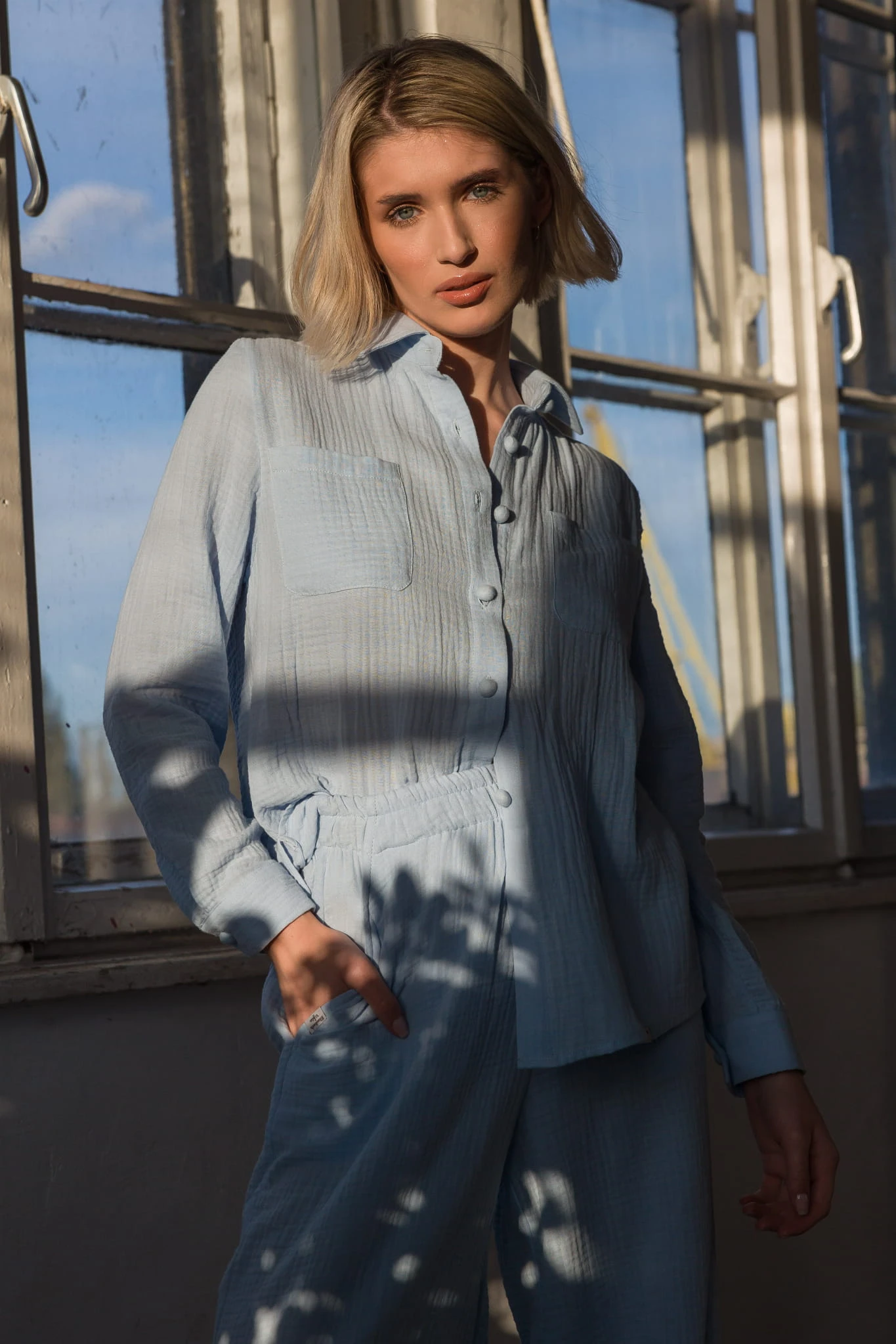 Uszyte z muślinu bawełnianego – oddychającego, miękkiego i przewiewnego materiału o naturalnej teksturze. Nasz muślin posiada certyfikat OEKO-TEX Standard 100, co gwarantuje bezpieczeństwo i najwyższą jakość. Materiał nie kurczy się po praniu, więc Twoje spodnie pozostaną w idealnym rozmiarze przez długi czas.