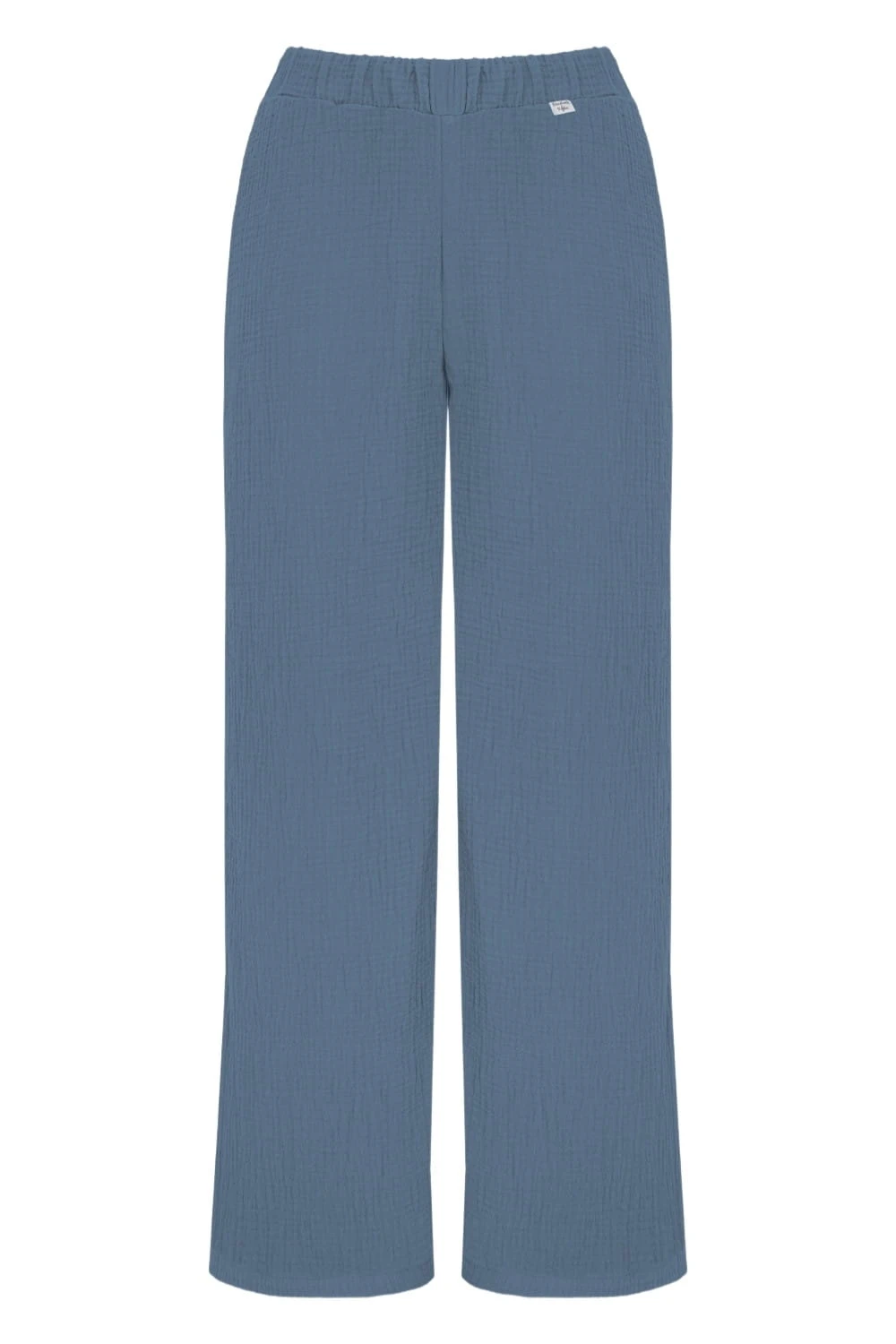 Uszyte z muślinu bawełnianego – oddychającego, miękkiego i przewiewnego materiału o naturalnej teksturze. Nasz muślin posiada certyfikat OEKO-TEX Standard 100, co gwarantuje bezpieczeństwo i najwyższą jakość. Materiał nie kurczy się po praniu, więc Twoje spodnie pozostaną w idealnym rozmiarze przez długi czas.