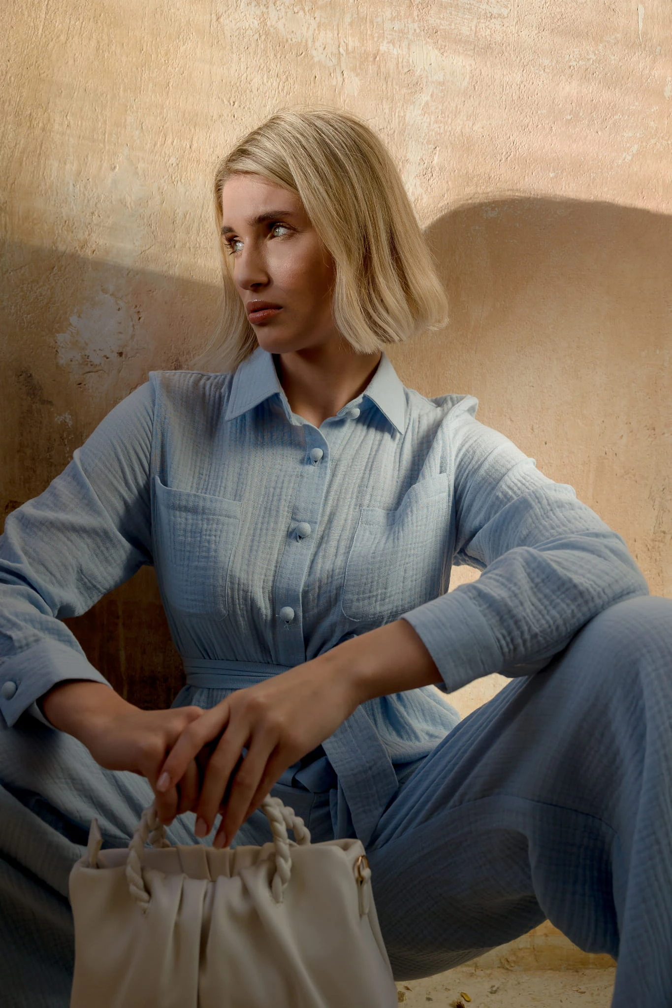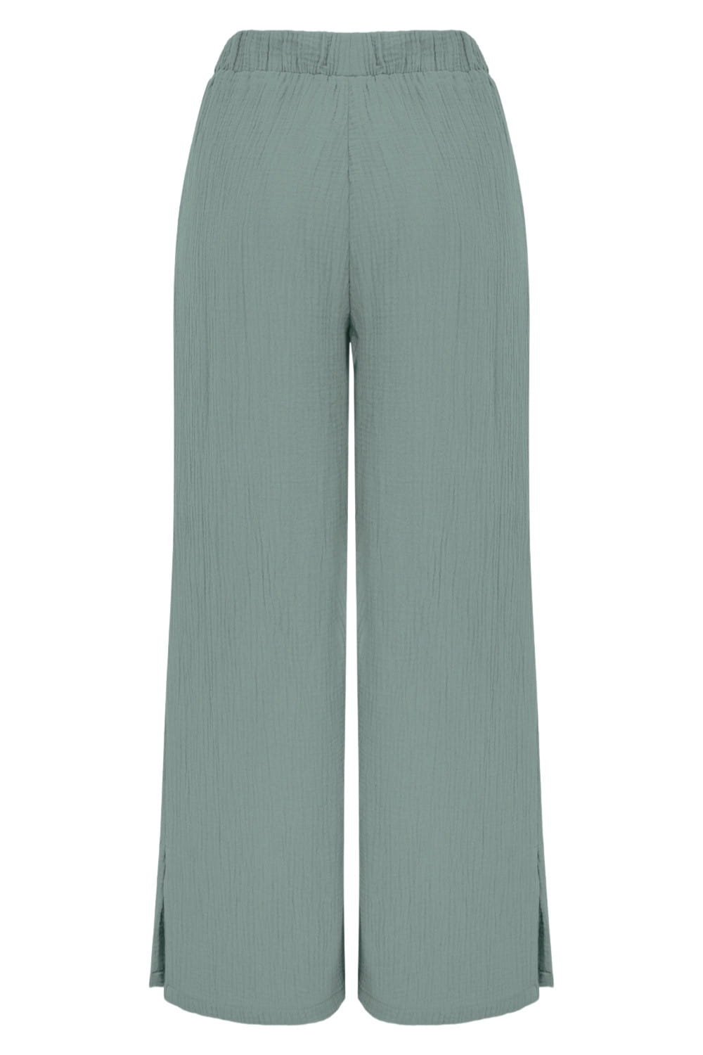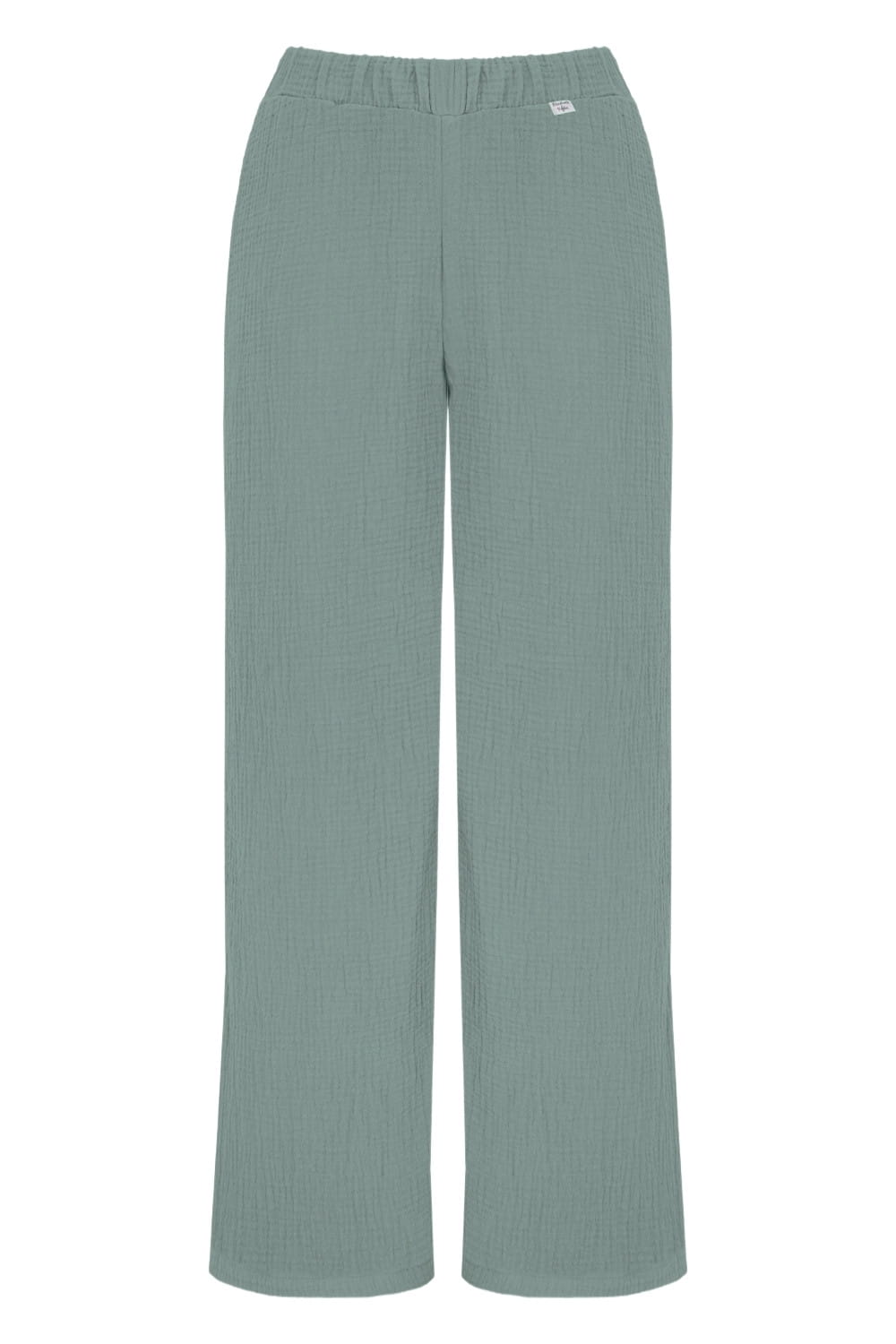 Uszyte z muślinu bawełnianego – oddychającego, miękkiego i przewiewnego materiału o naturalnej teksturze. Nasz muślin posiada certyfikat OEKO-TEX Standard 100, co gwarantuje bezpieczeństwo i najwyższą jakość. Materiał nie kurczy się po praniu, więc Twoje spodnie pozostaną w idealnym rozmiarze przez długi czas.
