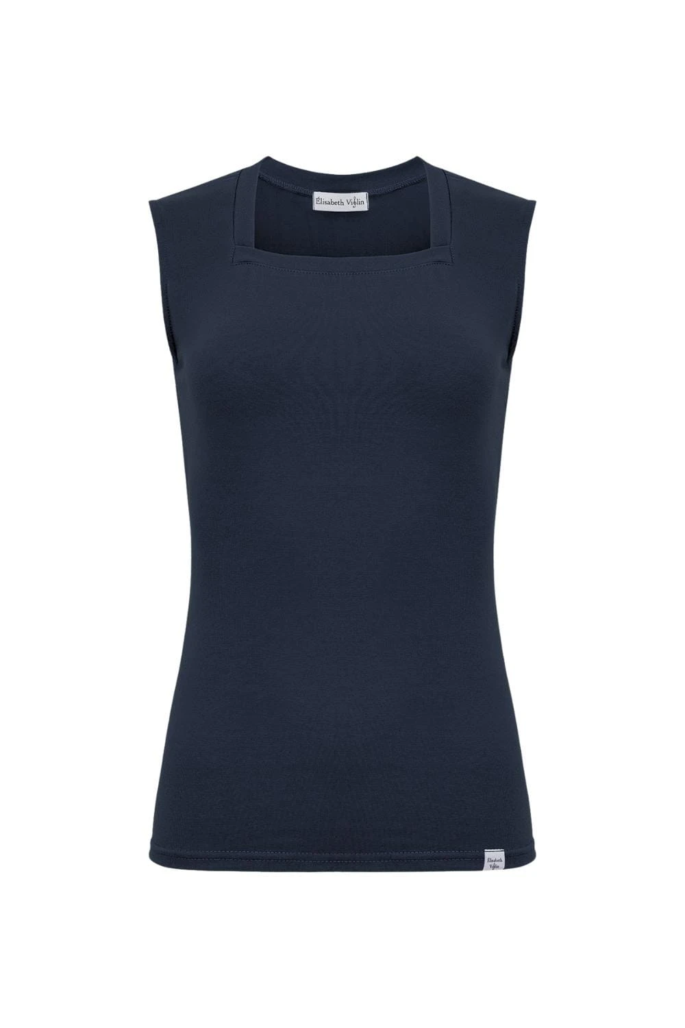 Kobieca, delikatnie taliowana bluzka z gładkiej bawełny z kwadratowym dekoltem. Jest bez rękawków - idealna pod marynarki i swetry, lub solo w cieplejsze dni.