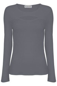 Dekolt o klasycznym okrągłym kształcie został urozmaicony zmysłowym wycięciem tuż nad linią biustu – to subtelny detal, który przyciąga uwagę, nie odsłaniając zbyt wiele.