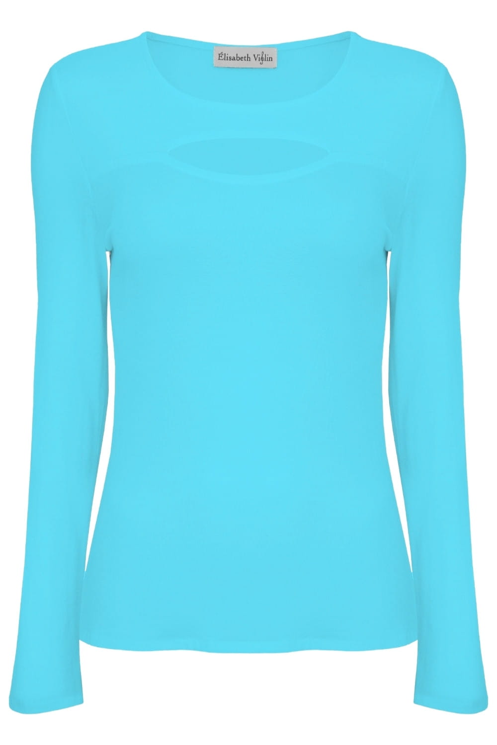 FARI - Cyan Blue - bawełniana taliowana bluzka z okrągłym dekoltem z wycięciem z klasycznymi długimi rękawami