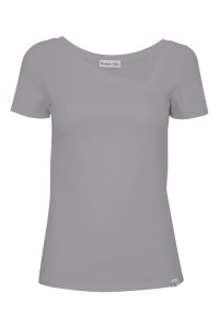 Dzianinowa bluzka z krótkim rękawem i subtelnym, asymetrycznym dekoltem.