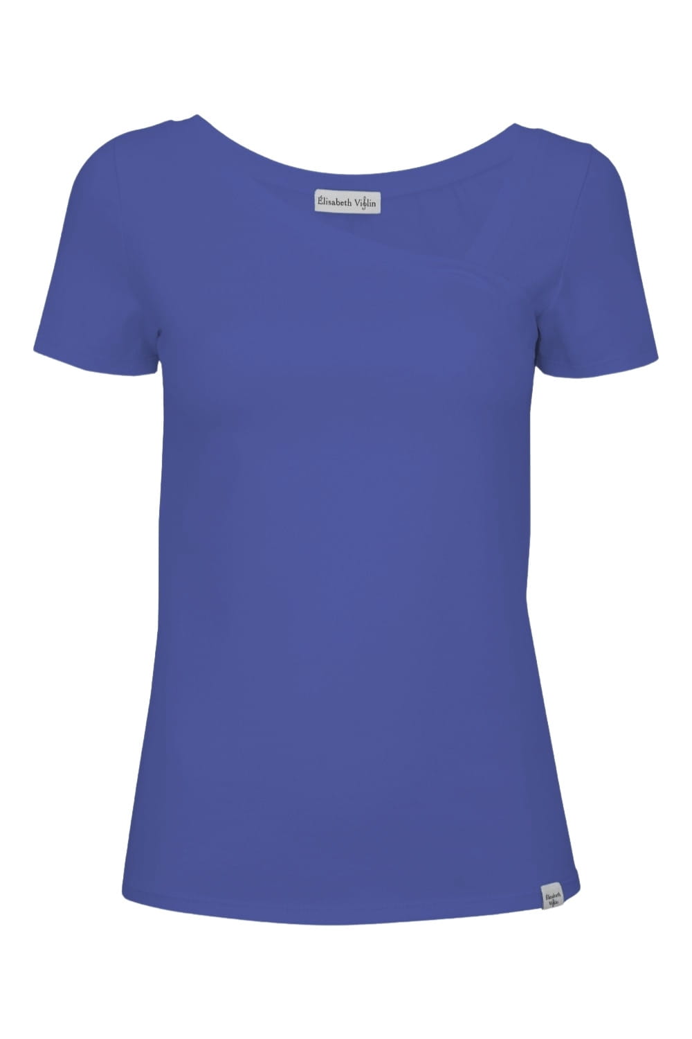 FLORA - Amparo Blue - wiskozowa taliowana bluzka z asymetrycznym dekoltem i klasycznymi krótkimi rękawami