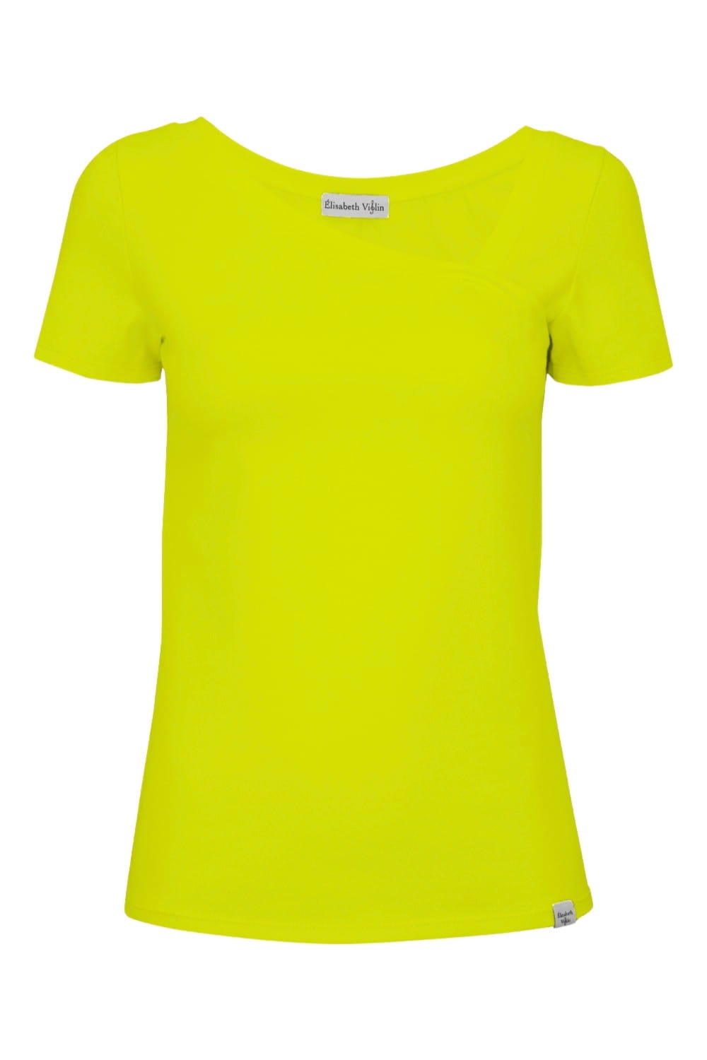 FLORA - Evening Primrose - bambusowa taliowana bluzka z asymetrycznym dekoltem i klasycznymi krótkimi rękawami