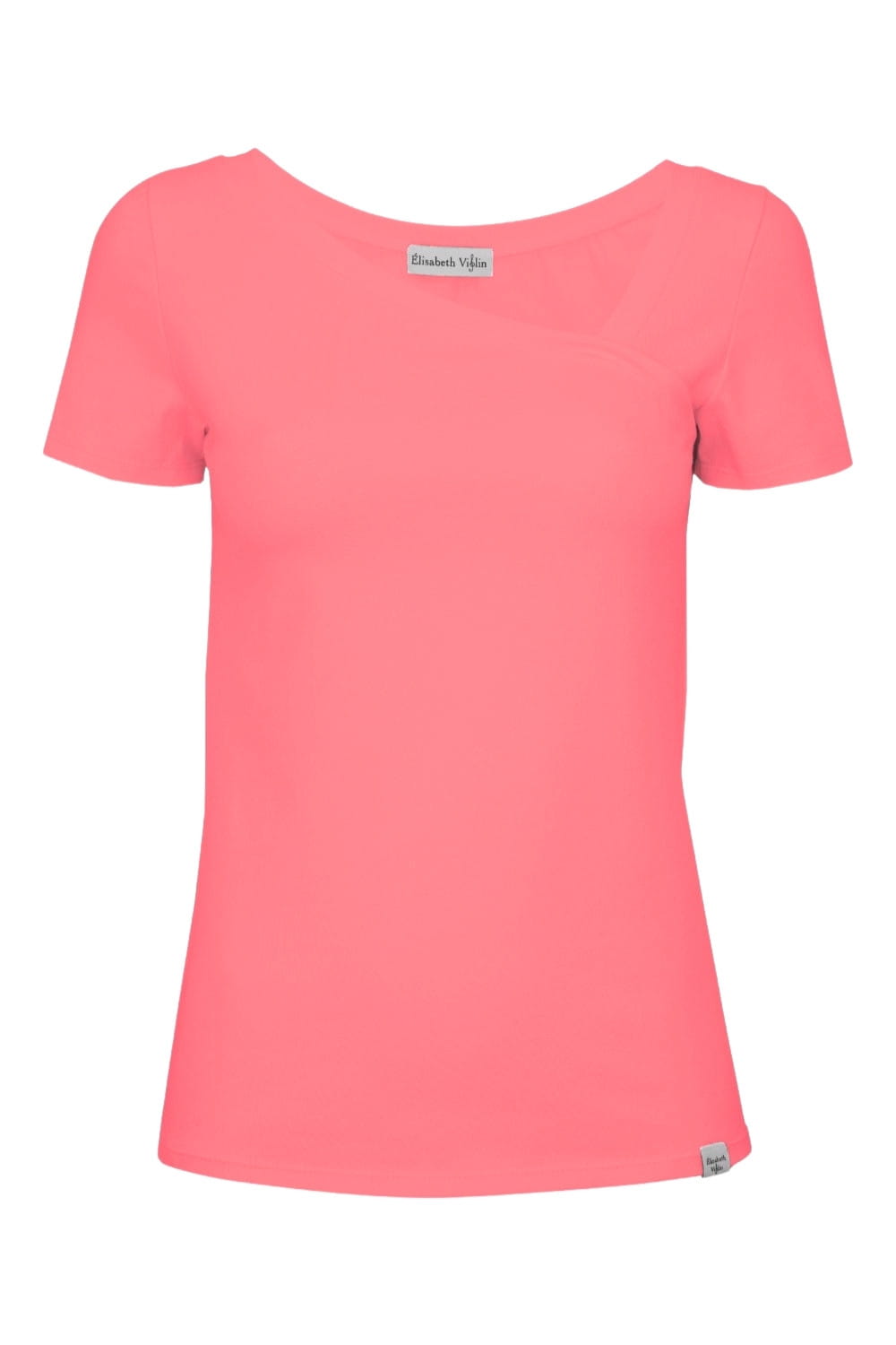 FLORA - Sunkist Coral - bawełniana taliowana bluzka z asymetrycznym dekoltem i klasycznymi krótkimi rękawami