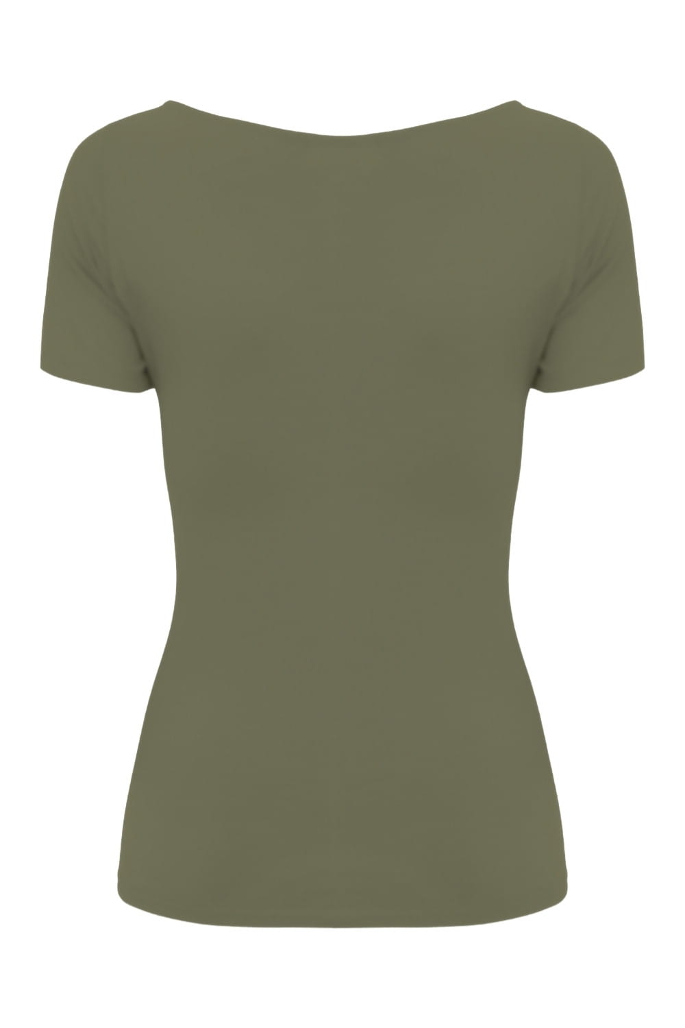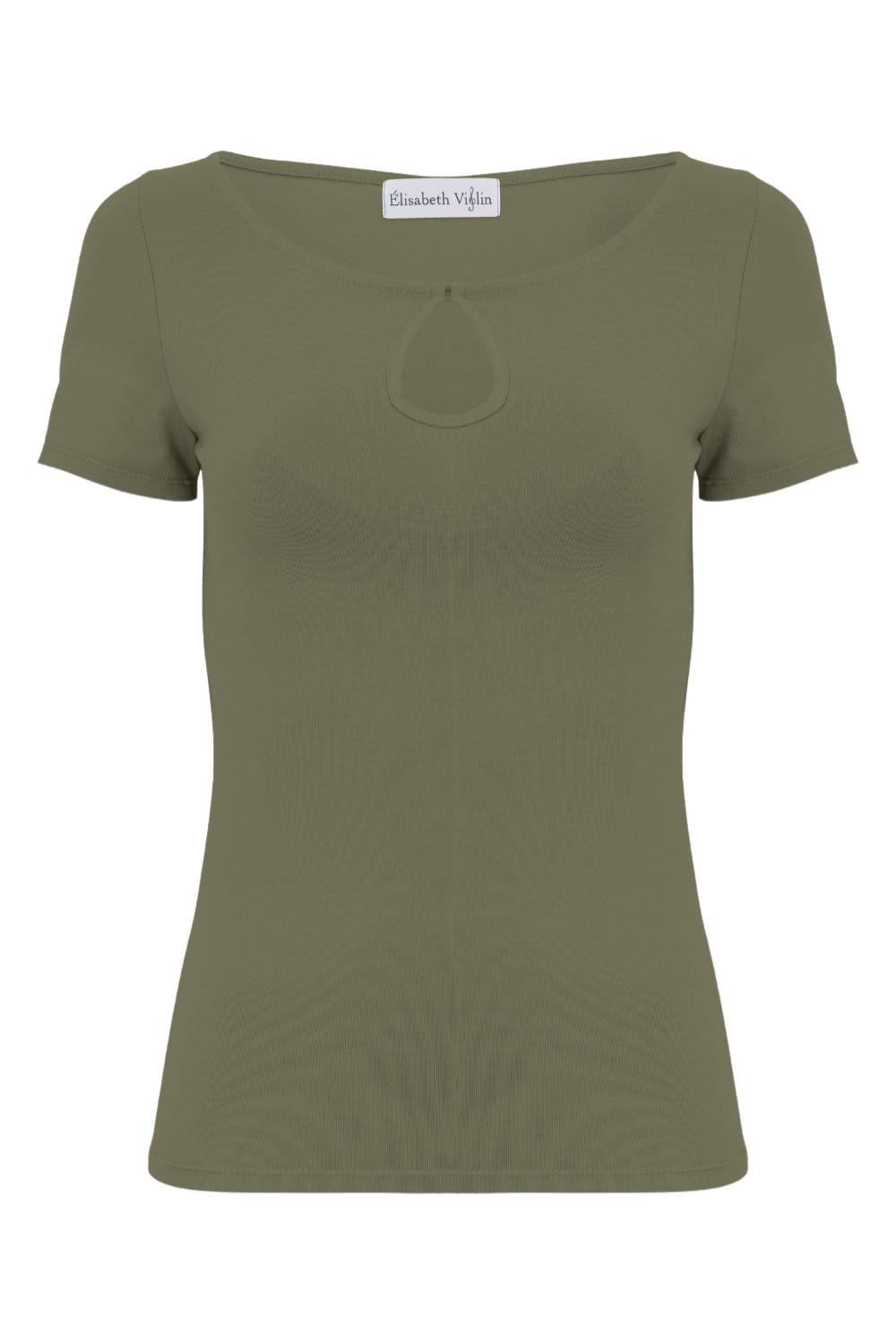 LARMA - Dusty Olive - bambusowa taliowana bluzka z dekoltem z łezką i klasycznymi krótkimi rękawami