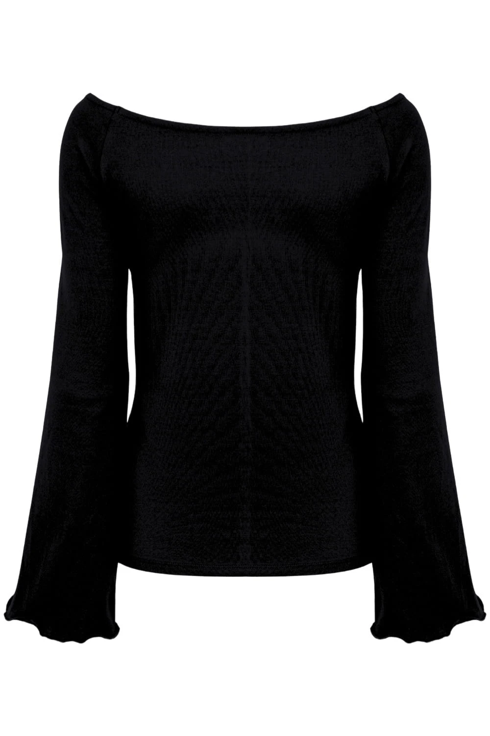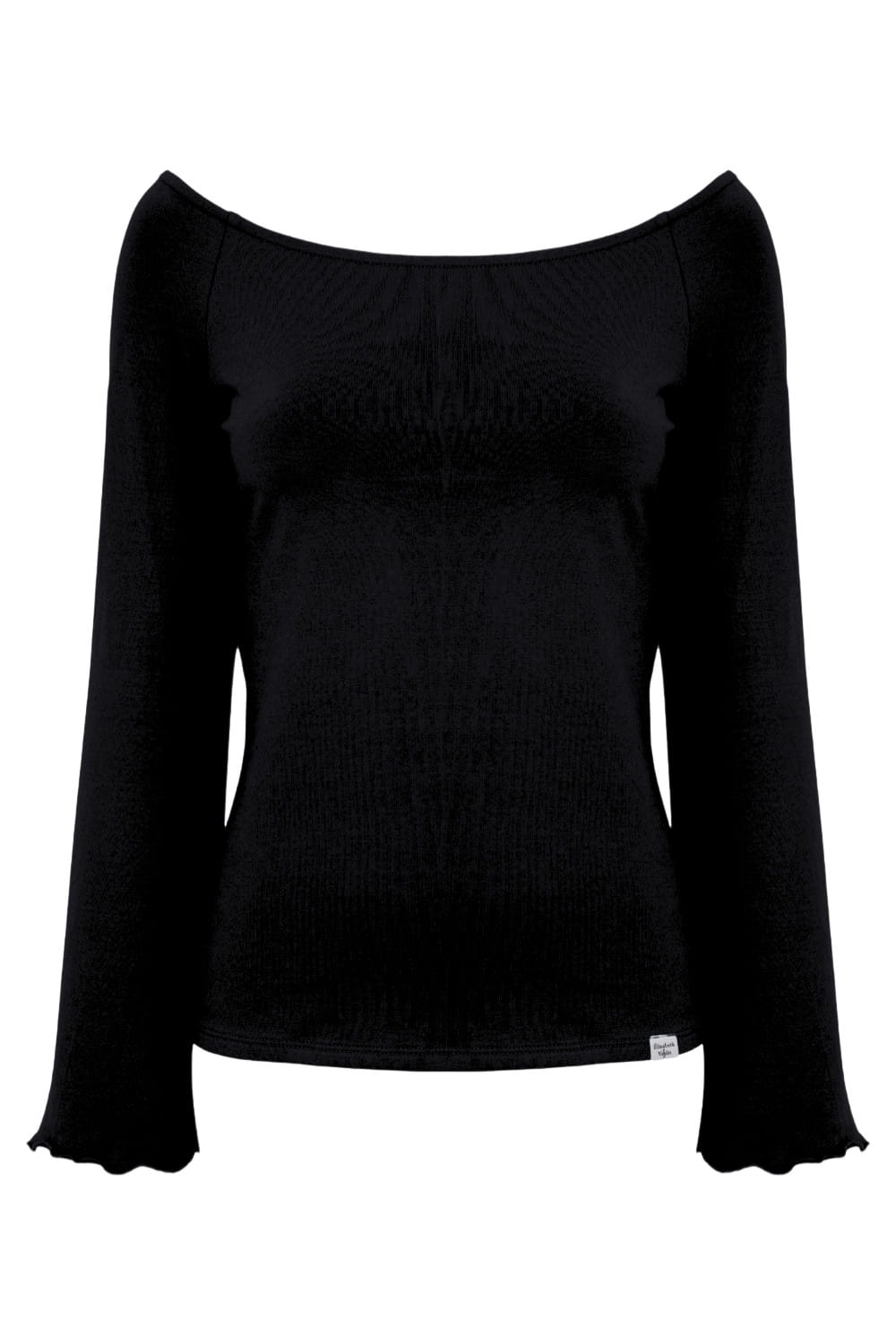 LAURA - Black - bawełniana taliowana bluzka z długimi reglanowymi rękawkami typu dzwonek z szerokim dekoltem w łódkę