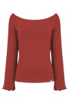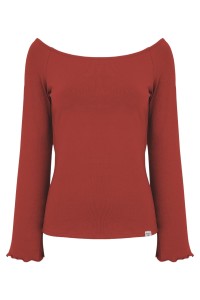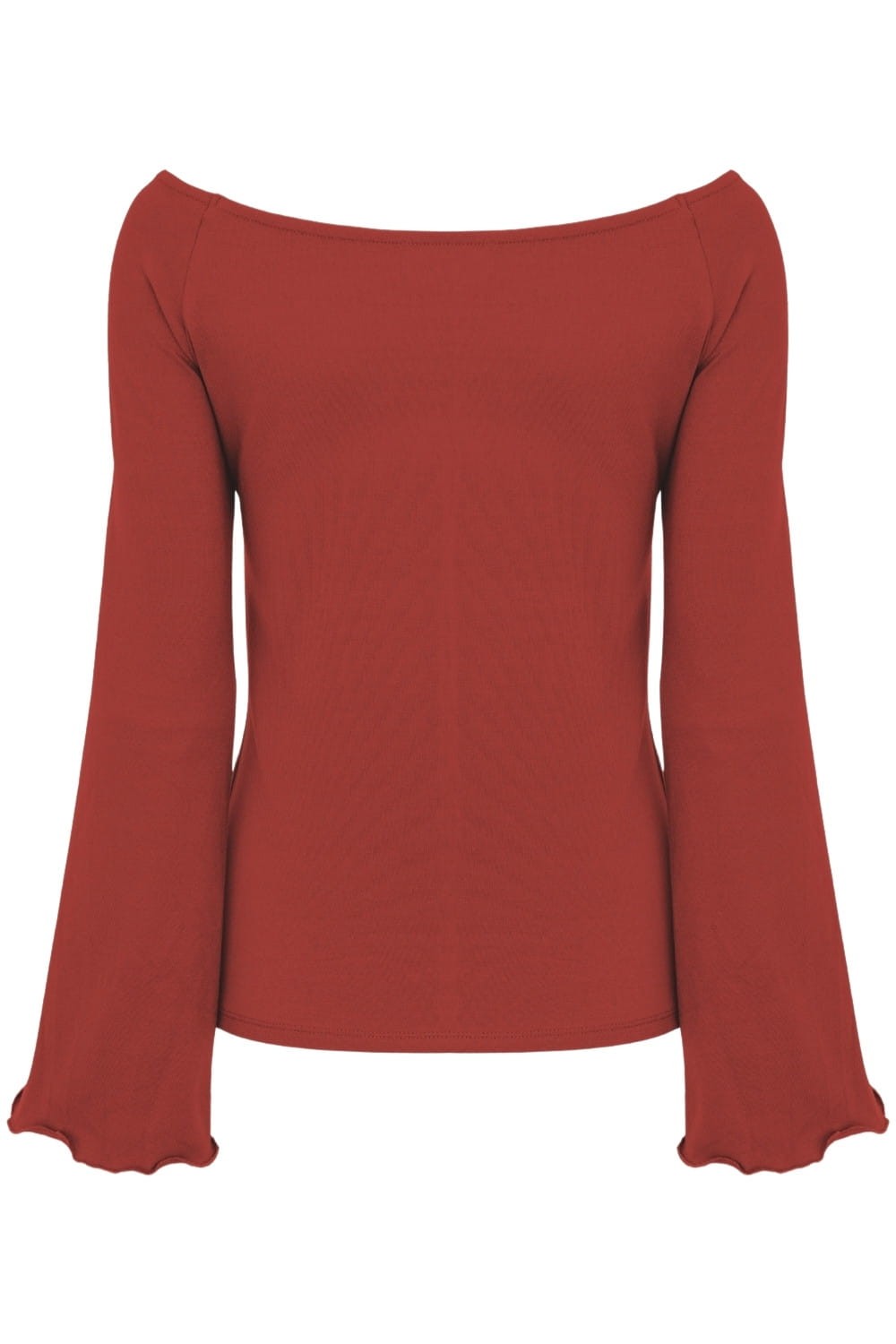 LAURA - Brick Red - bawełniana taliowana bluzka z długimi reglanowymi rękawkami typu dzwonek z szerokim dekoltem w łódkę