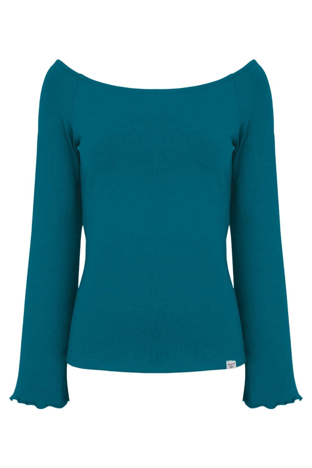 LAURA - Celestial - bawełniana taliowana bluzka z długimi reglanowymi rękawkami typu dzwonek z szerokim dekoltem w łódkę
