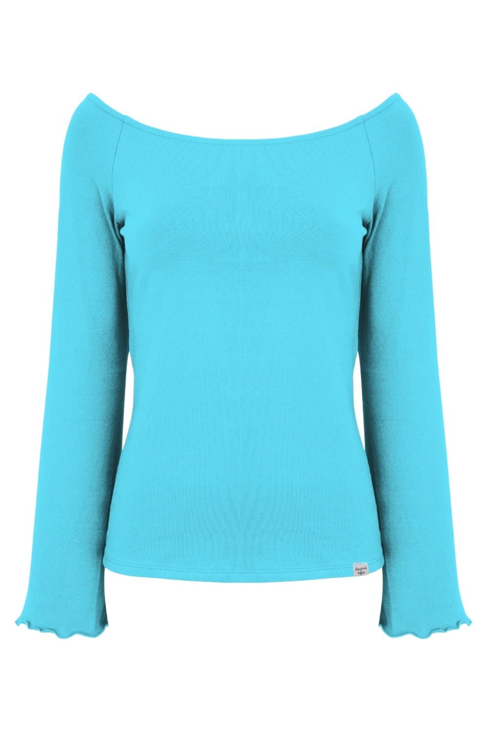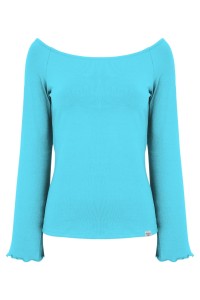 LAURA - Cyan Blue - bawełniana taliowana bluzka z długimi reglanowymi rękawkami typu dzwonek z szerokim dekoltem w łódkę