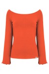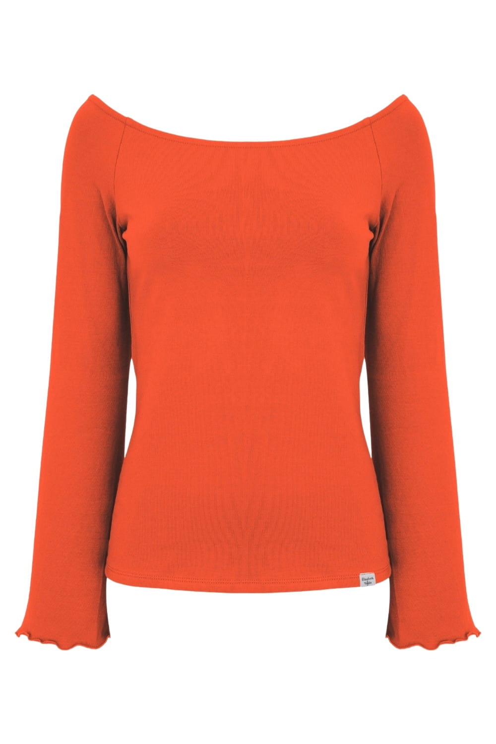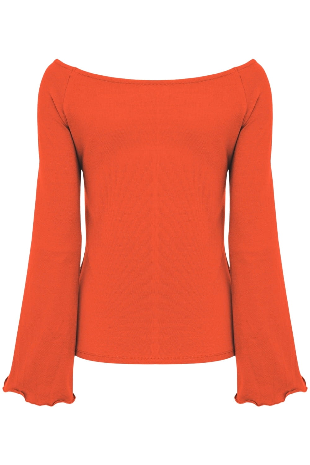LAURA - Flame Scarlet - wiskozowa taliowana bluzka z długimi reglanowymi rękawkami typu dzwonek z szerokim dekoltem w łódkę