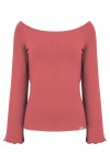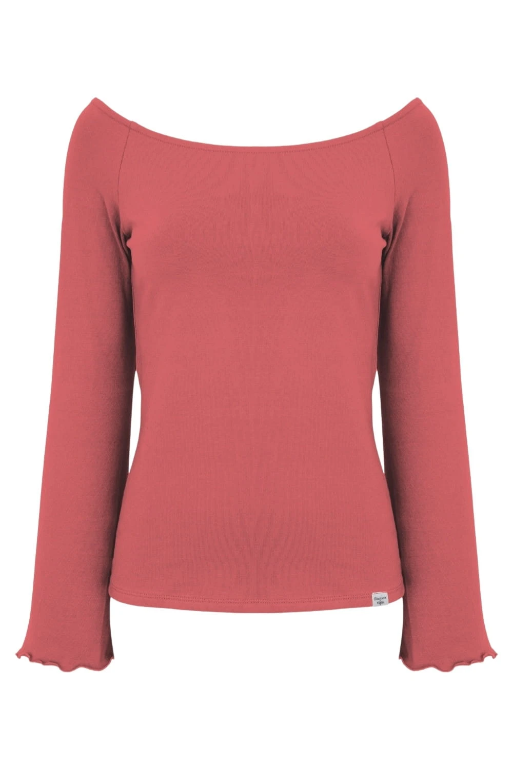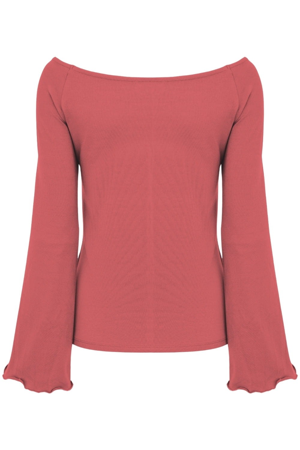 LAURA - Garnet Rose - wiskozowa taliowana bluzka z długimi reglanowymi rękawkami typu dzwonek z szerokim dekoltem w łódkę