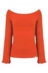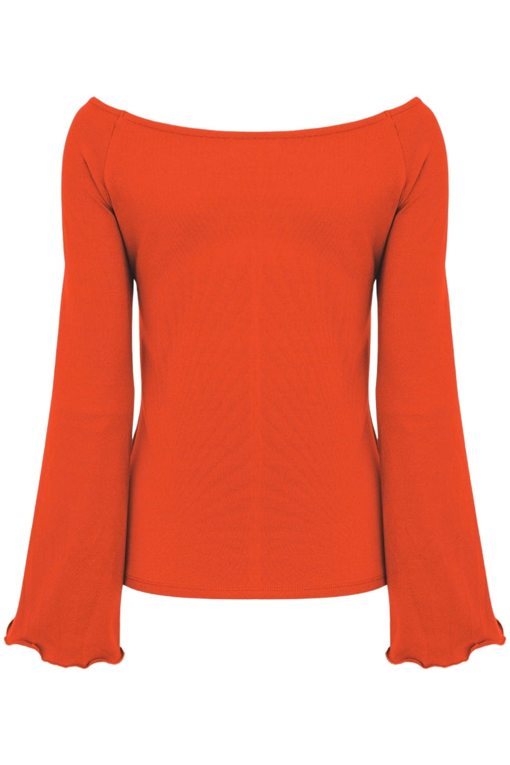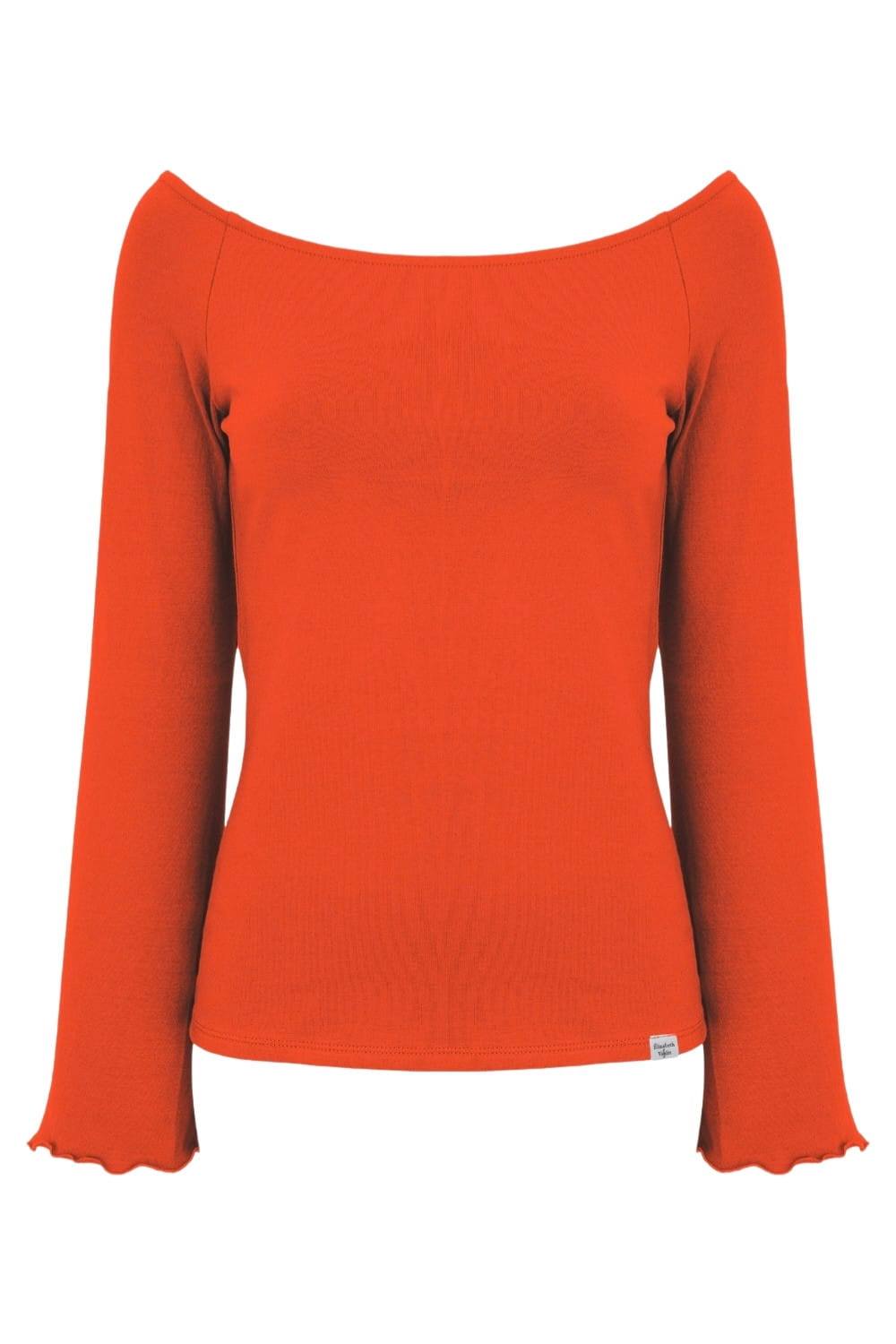 LAURA - Mandarin Red - bawełniana taliowana bluzka z długimi reglanowymi rękawkami typu dzwonek z szerokim dekoltem w łódkę