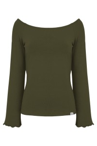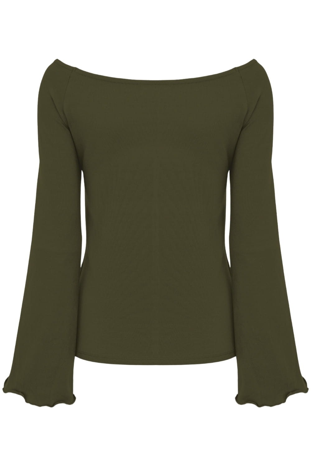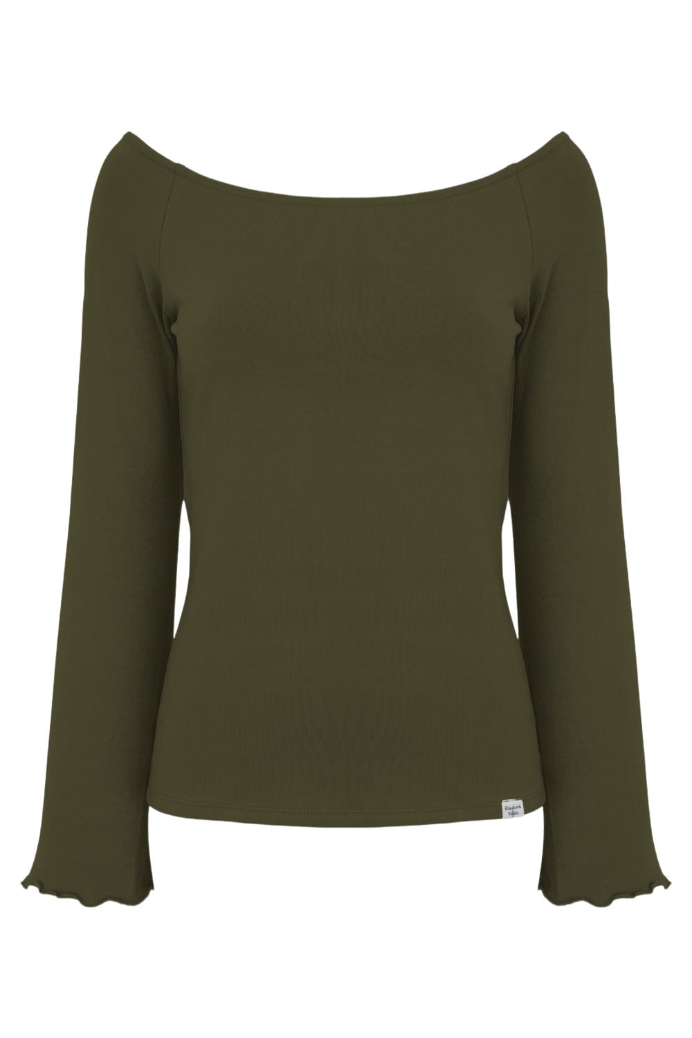 LAURA - Olive Night - wiskozowa taliowana bluzka z długimi reglanowymi rękawkami typu dzwonek z szerokim dekoltem w łódkę