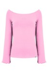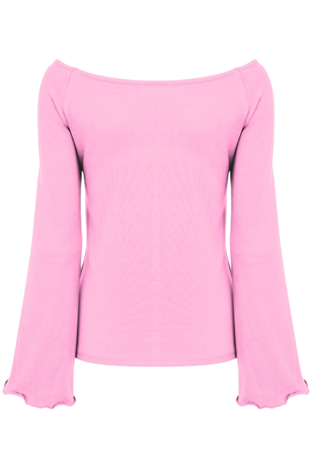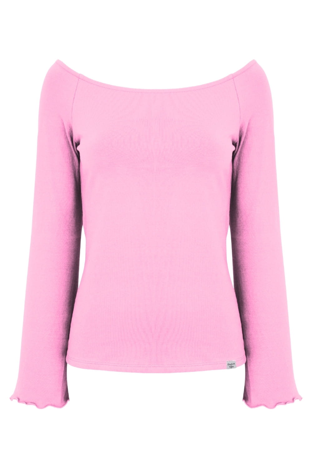 LAURA - Sea Pink - wiskozowa taliowana bluzka z długimi reglanowymi rękawkami typu dzwonek z szerokim dekoltem w łódkę