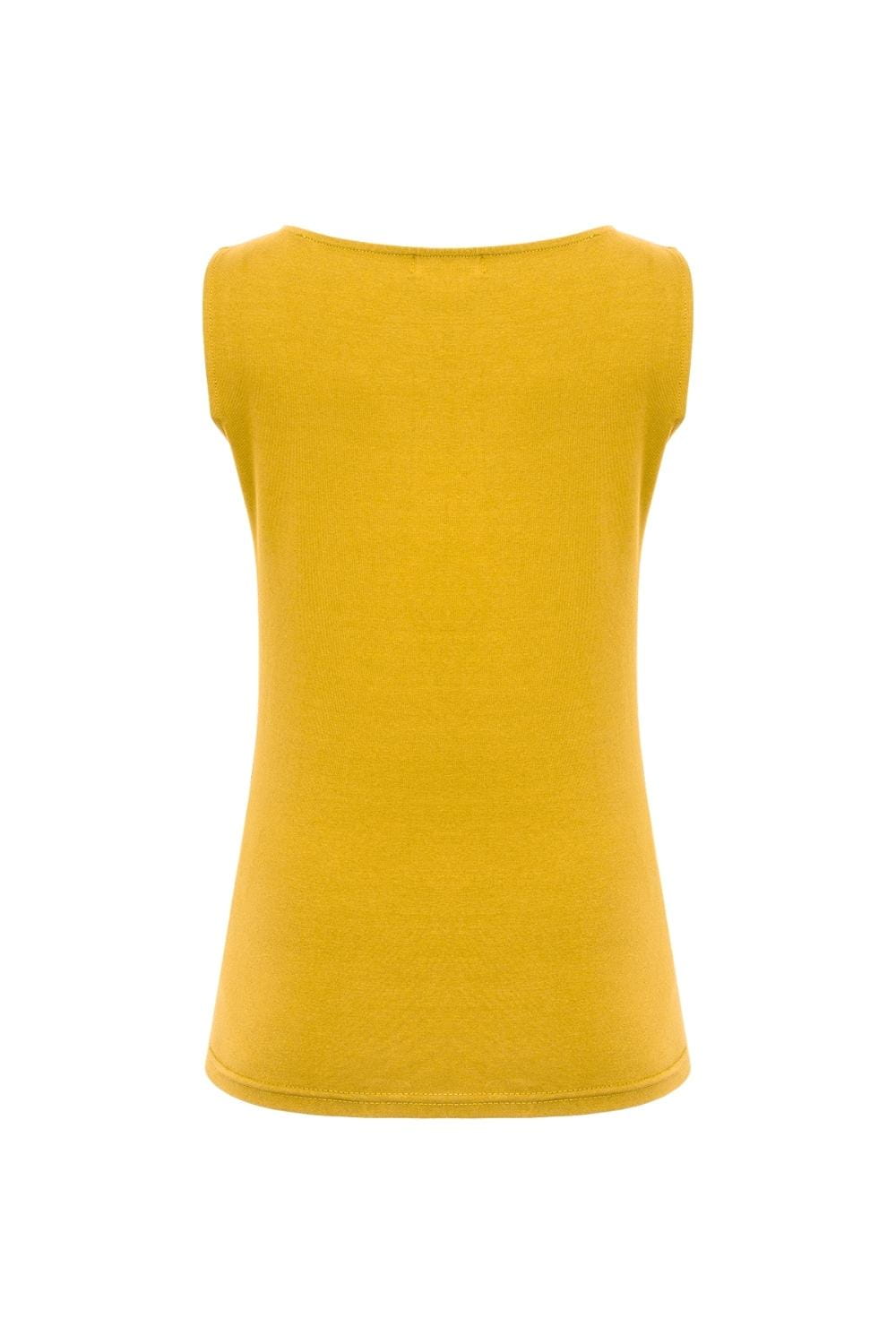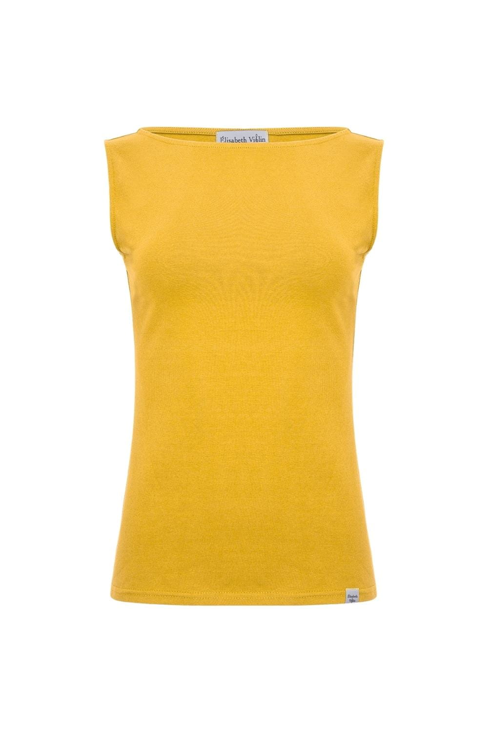 Kobieca, delikatnie taliowana bluzka z wiskozy z dekoltem w łódkę. Jest bez rękawków - idealna pod marynarki i swetry, lub solo w cieplejsze dni.