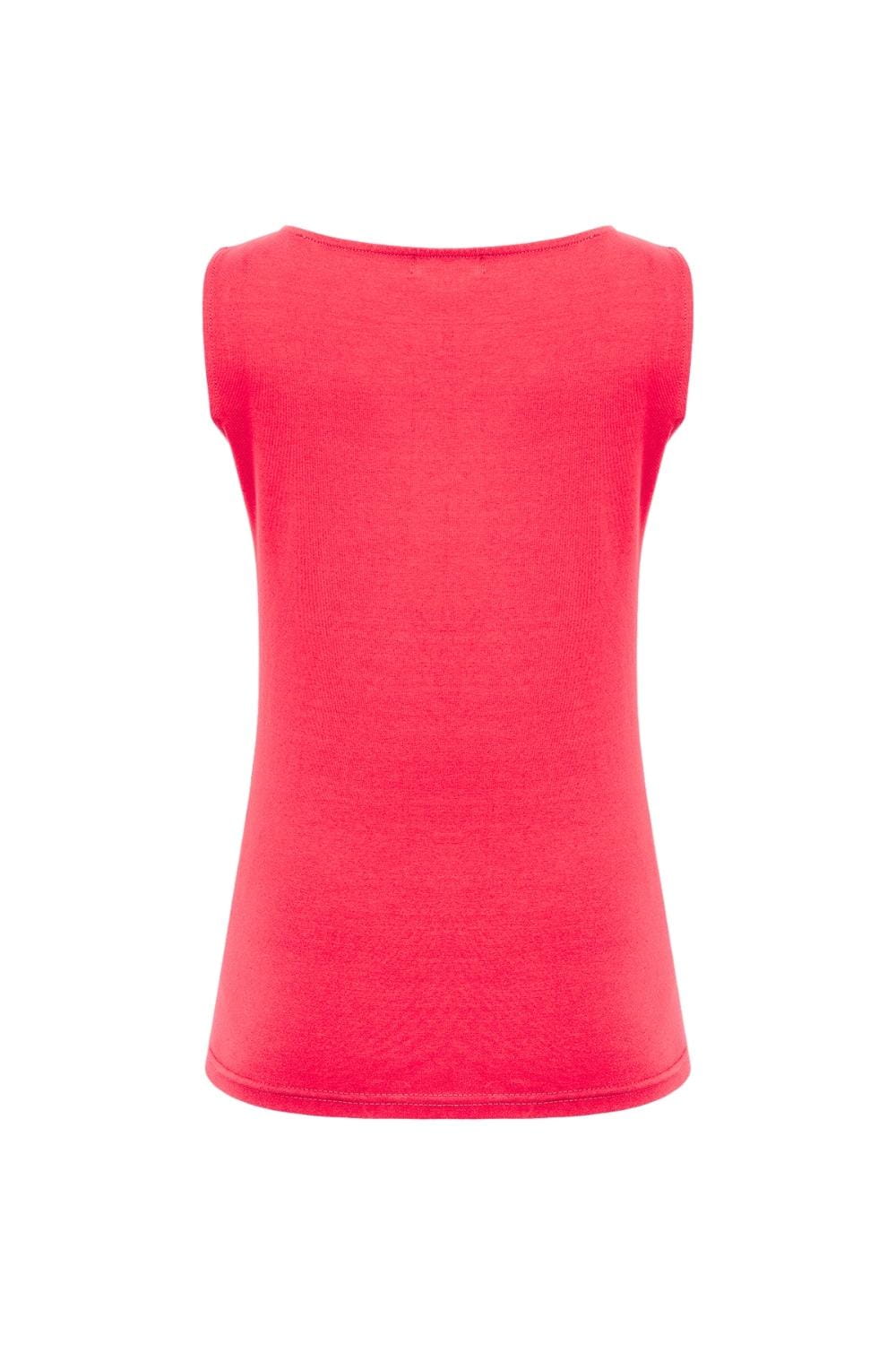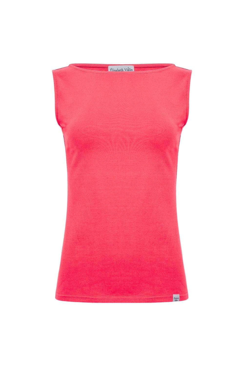 Kobieca, delikatnie taliowana bluzka z wiskozy z dekoltem w łódkę. Jest bez rękawków - idealna pod marynarki i swetry, lub solo w cieplejsze dni.