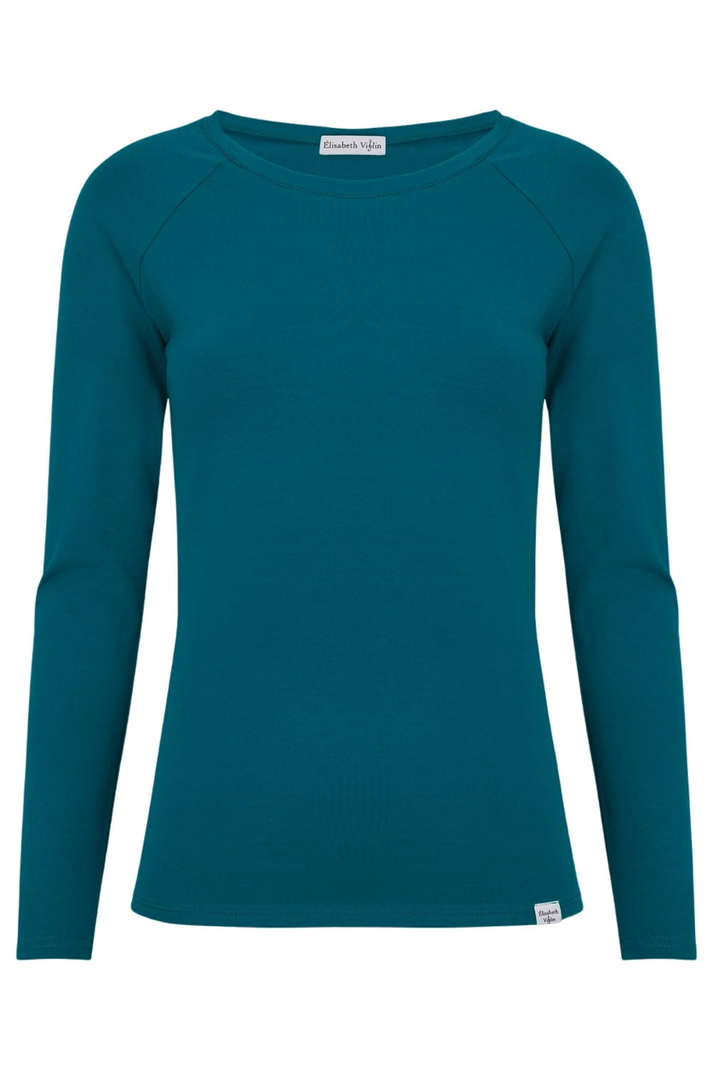MAYA - Moroccan Blue - bawełniana taliowana bluzka z okrągłym dekoltem i długimi rękawami reglanowymi