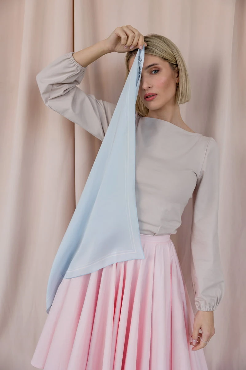 Jasny, chłodny odcień niebieskiego z subtelną szarością, przypominający kolor delikatnego zimowego nieba. Elegancki i stonowany, idealnie współgra z chłodnymi typami urody, dodając stylizacjom lekkości i harmonii.