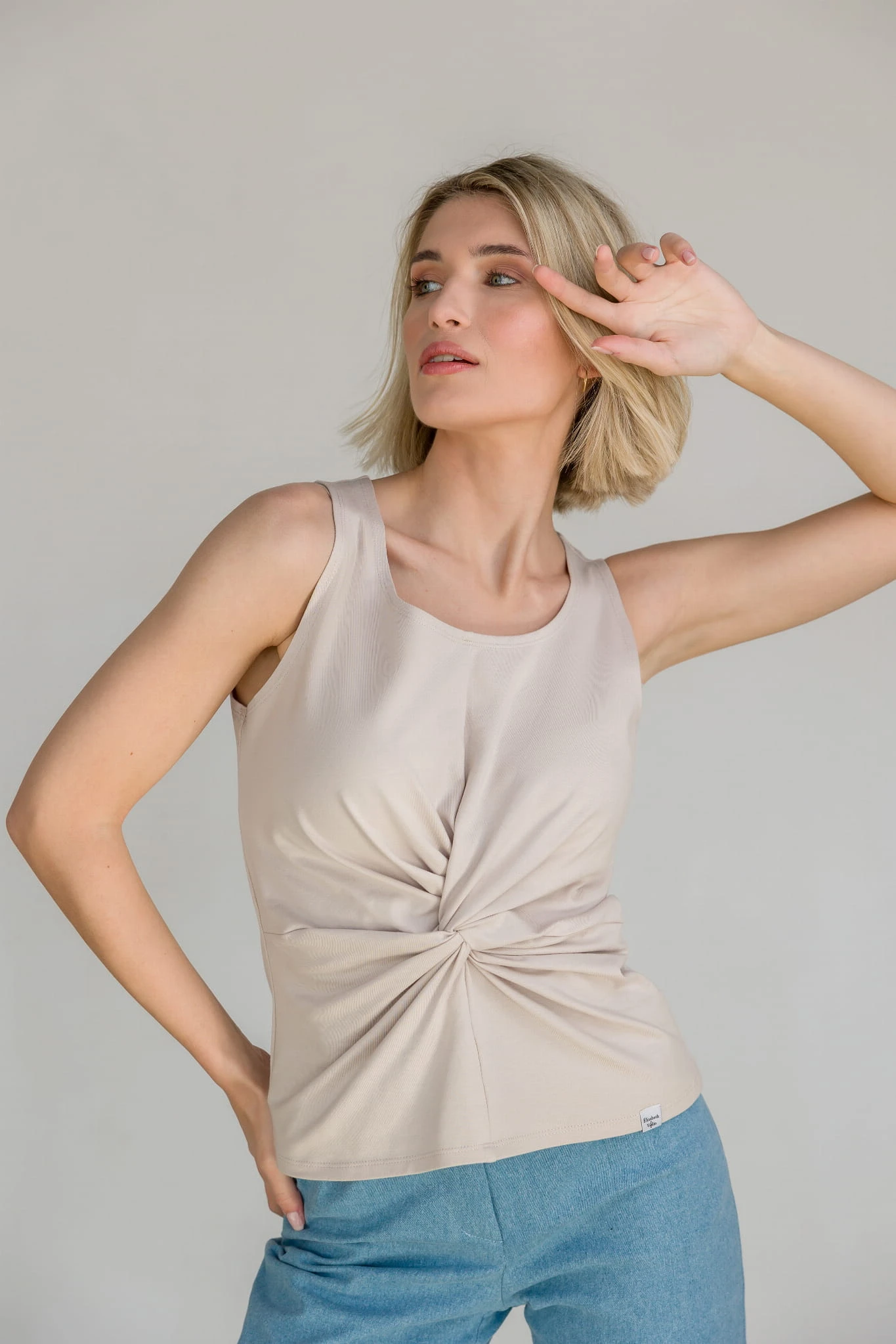 MIXY - Ganache - wiskozowa taliowana bluzka z ozdobnym węzłem w talii, okrągłym dekoltem i bez rękawków