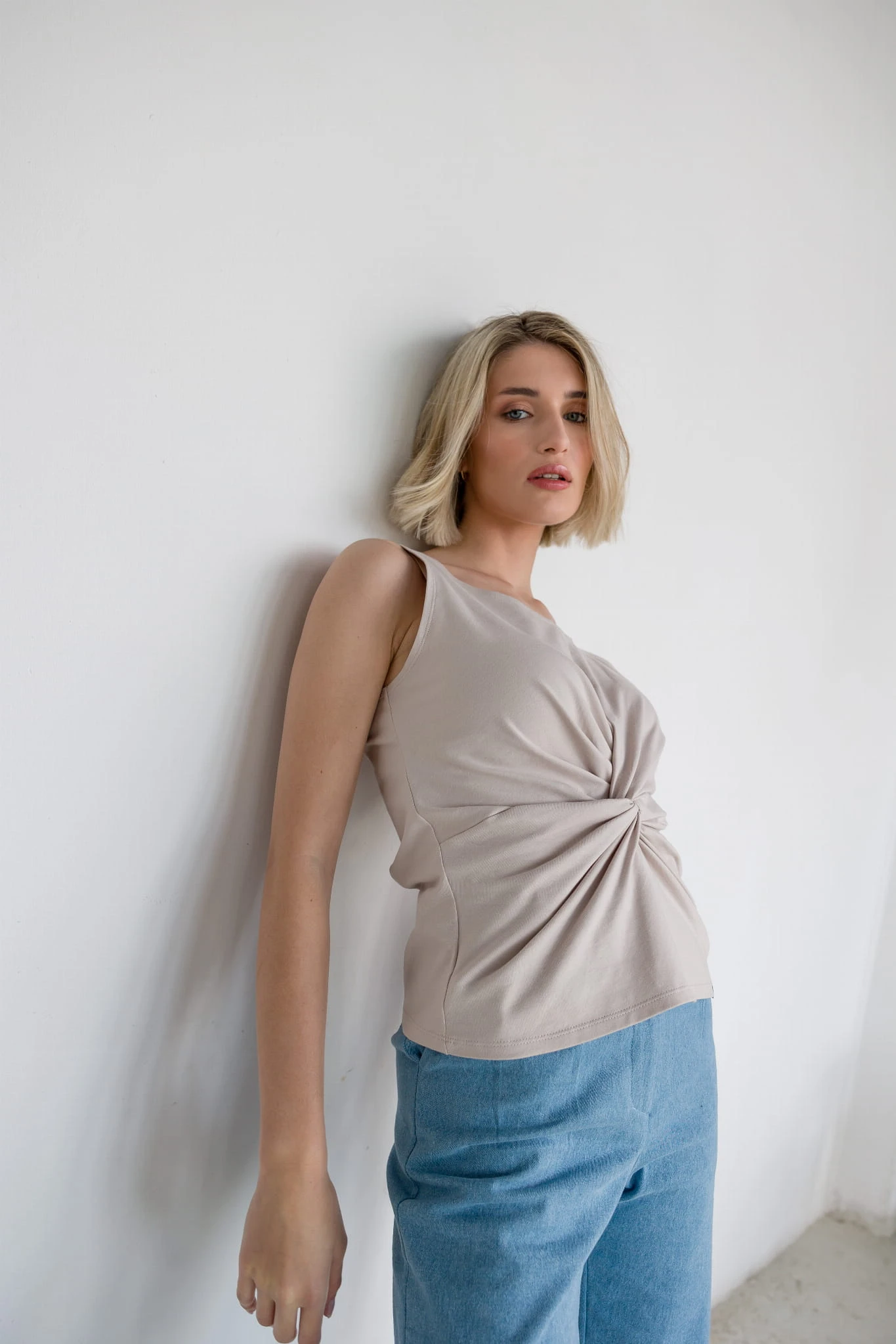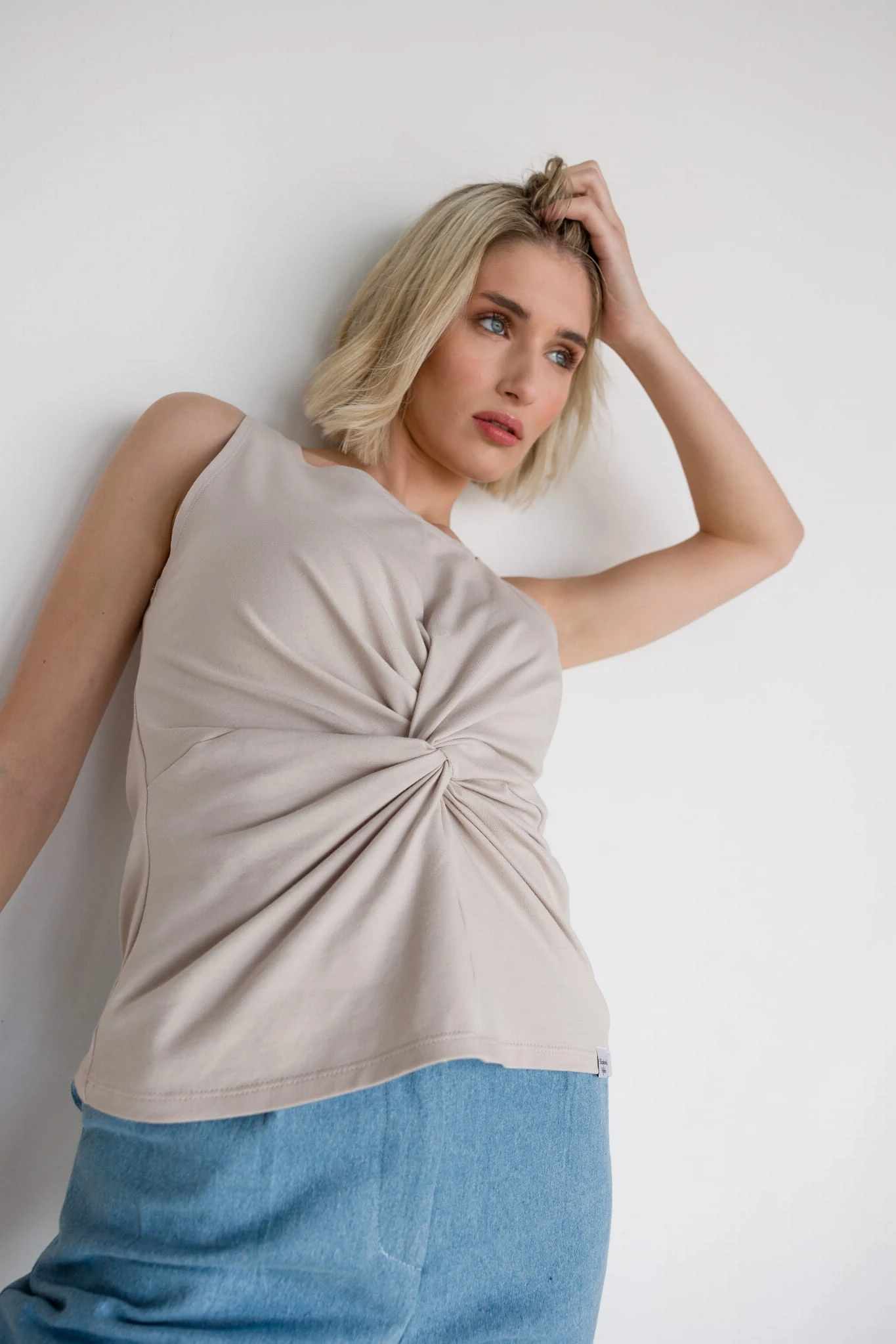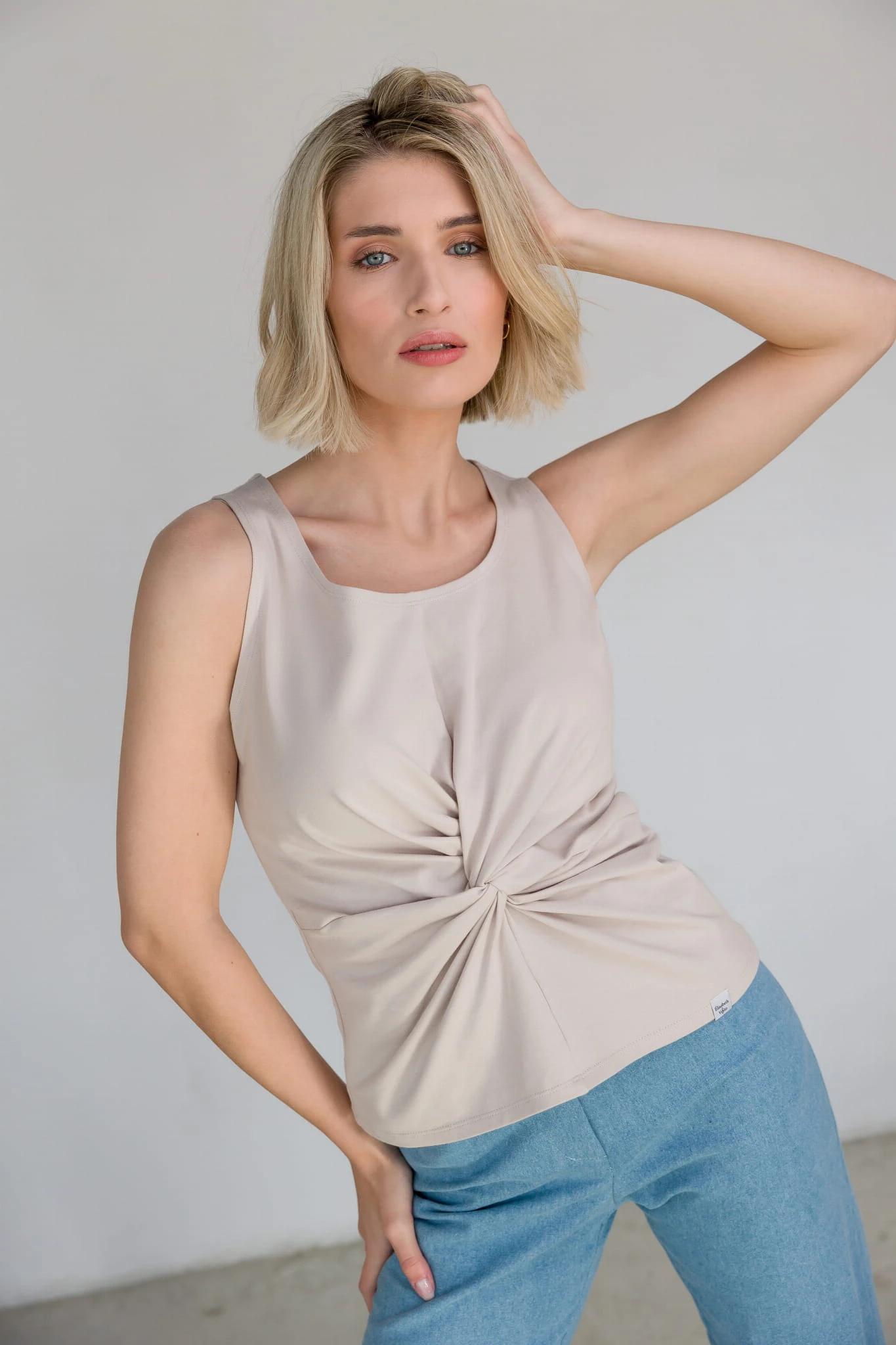Delikatnie taliowana bluzka bez rękawów z miękkiej dzianiny, ozdobiona efektownym węzłem na wysokości talii. Kobieca, oryginalna i bardzo wygodna – świetna zarówno na co dzień, jak i na specjalne okazje. Zawsze wtedy, gdy chcesz przyciągnąć spojrzenia i zachwycić subtelną elegancją!