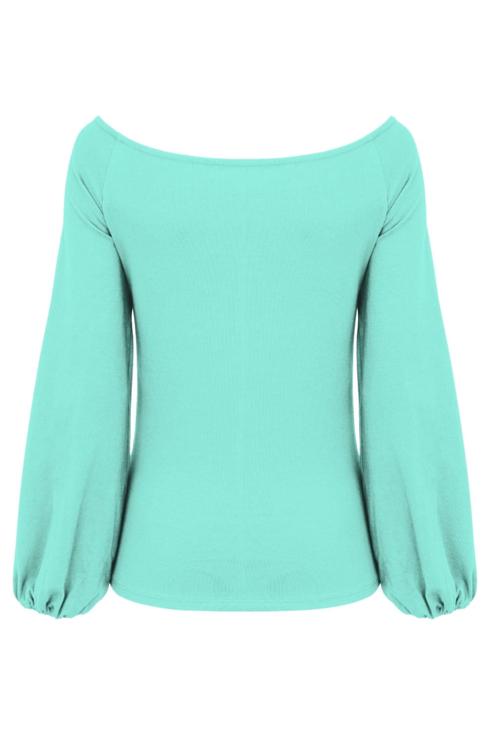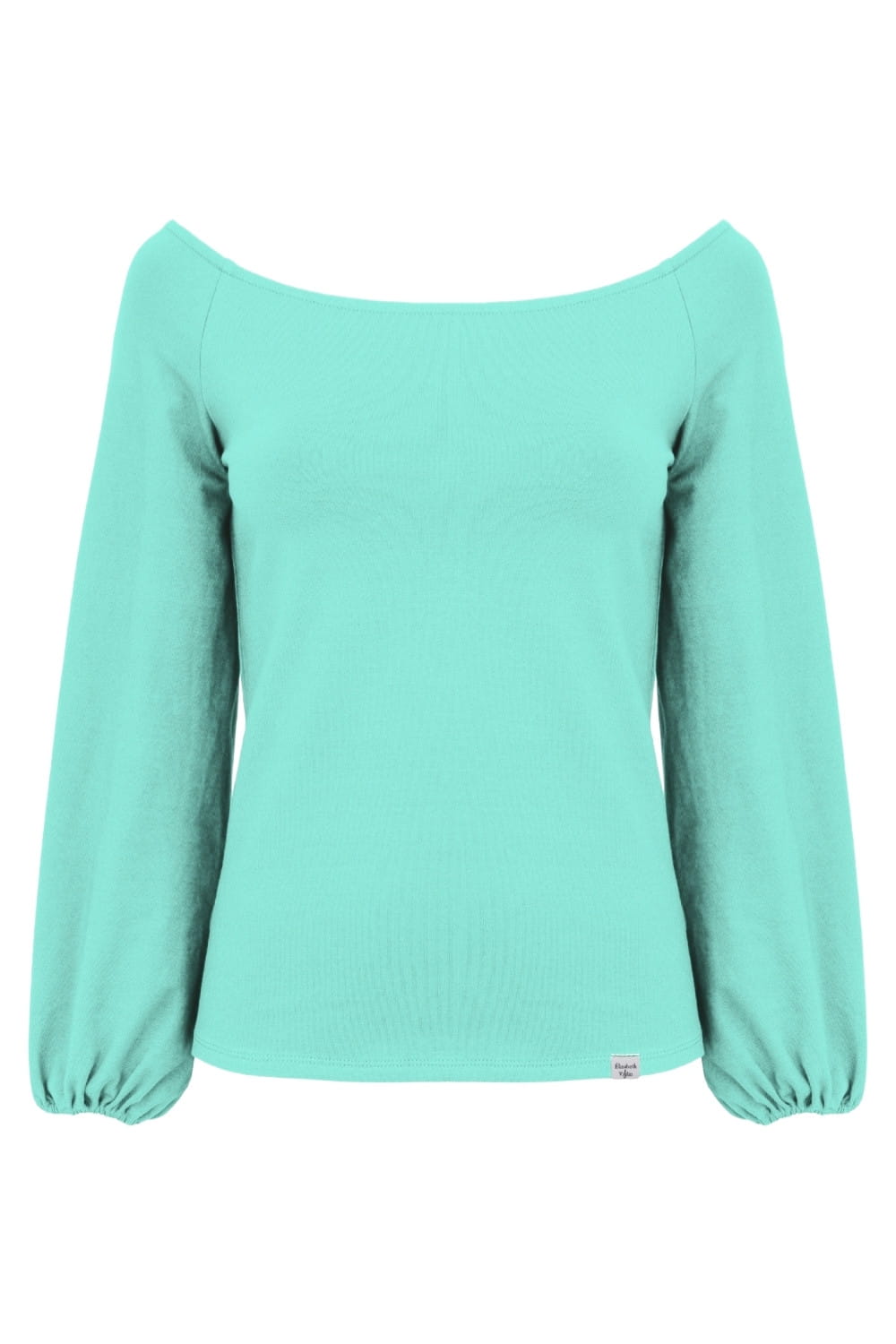 MORELLA - Blue Turquoise - wiskozowa taliowana bluzka z długimi szerokimi reglanowymi rękawkami zakończonymi gumką z szerokim dekoltem w łódkę