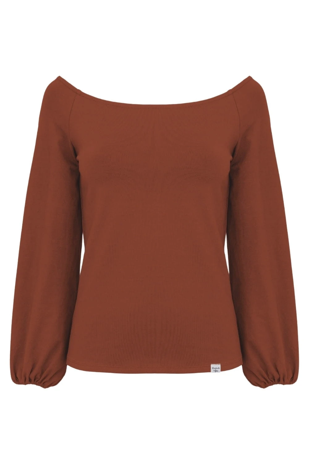 MORELLA - Burnt Henna - wiskozowa taliowana bluzka z długimi szerokimi reglanowymi rękawkami zakończonymi gumką z szerokim dekoltem w łódkę