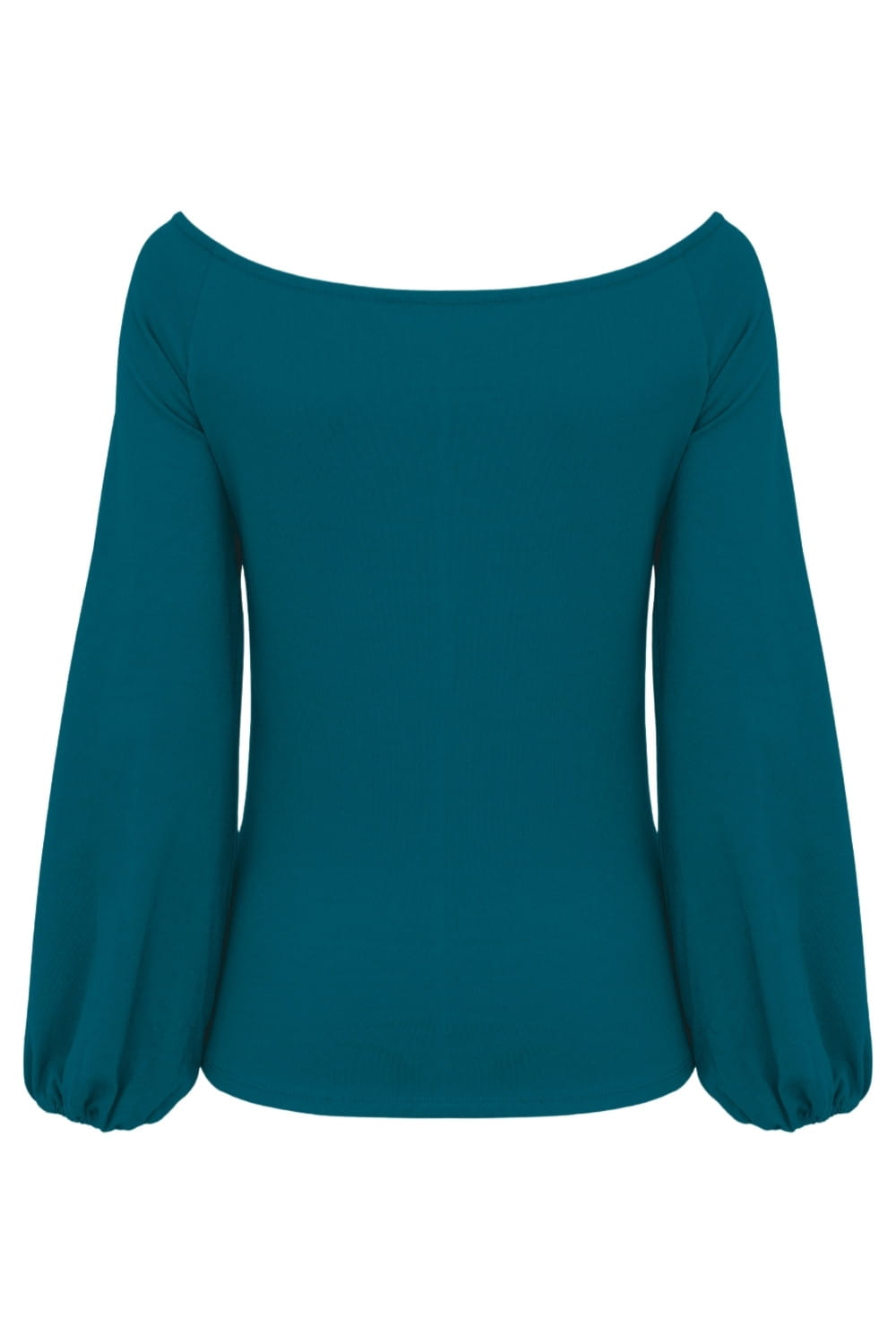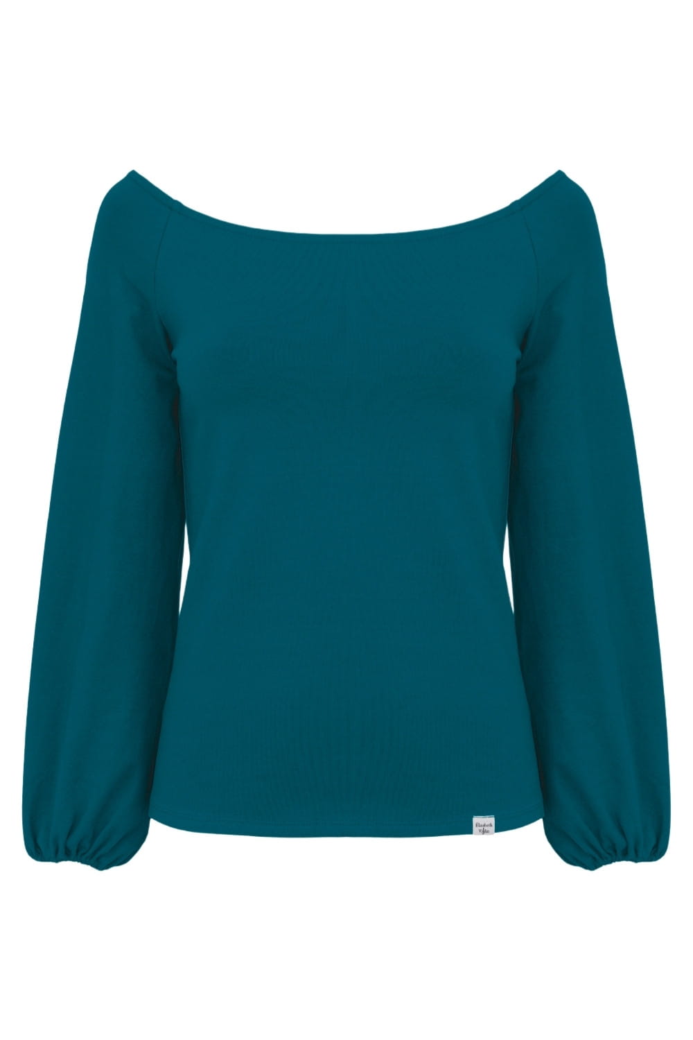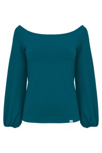 MORELLA - Moroccan Blue - wiskozowa taliowana bluzka z długimi szerokimi reglanowymi rękawkami zakończonymi gumką z szerokim dekoltem w łódkę