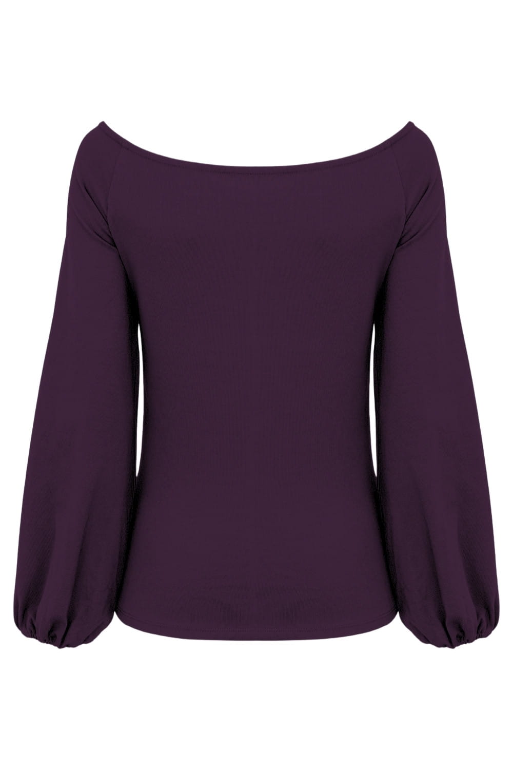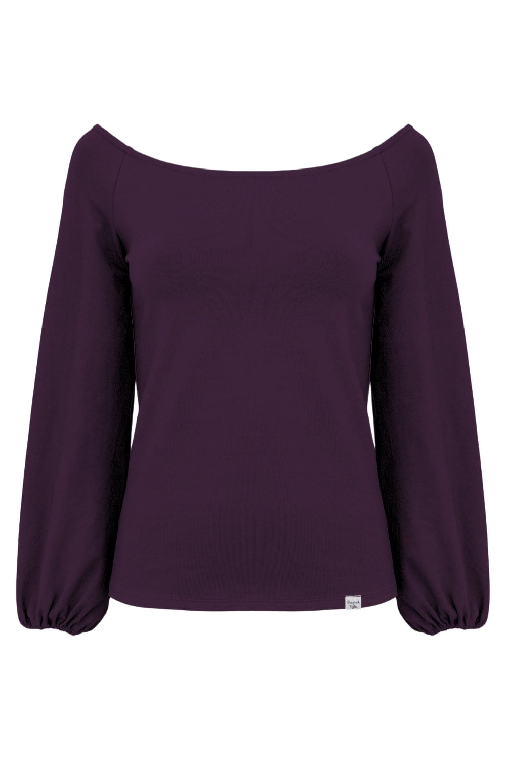 MORELLA - Plum Purple - bambusowa taliowana bluzka z długimi szerokimi reglanowymi rękawkami zakończonymi gumką z szerokim dekoltem w łódkę