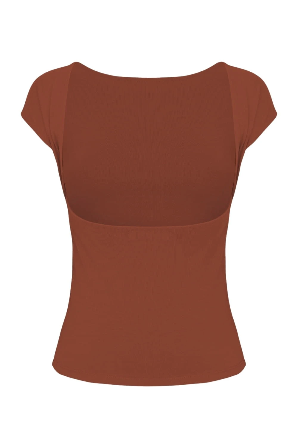 RHÉA - Burnt Henna - wiskozowa taliowana bluzka z wycięciem na plecach i krótkimi rękawami