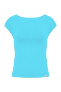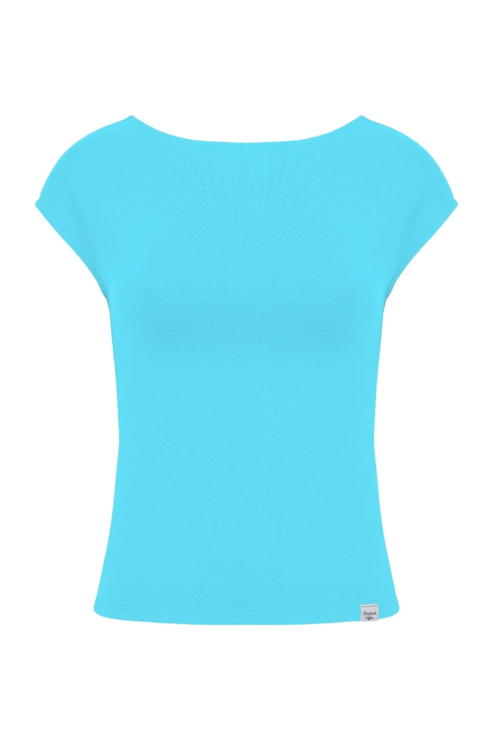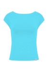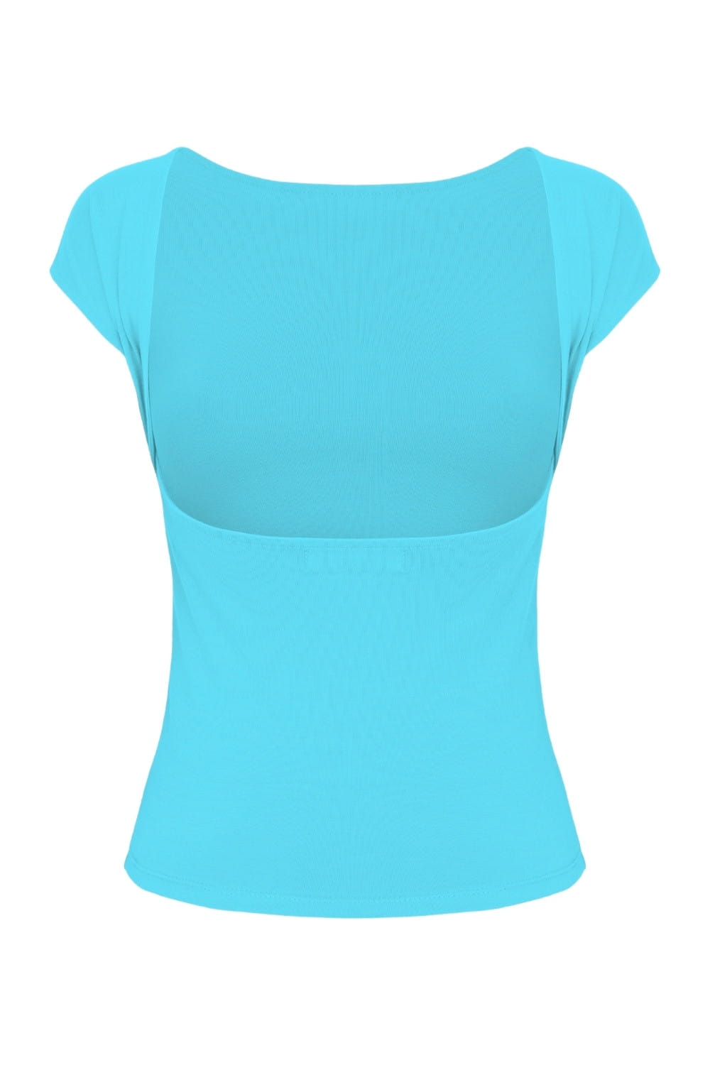RHÉA - Cyan Blue - bawełniana taliowana bluzka z wycięciem na plecach i krótkimi rękawami