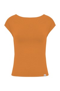 RHÉA - Golden Ochre - bambusowa taliowana bluzka z wycięciem na plecach i krótkimi rękawami