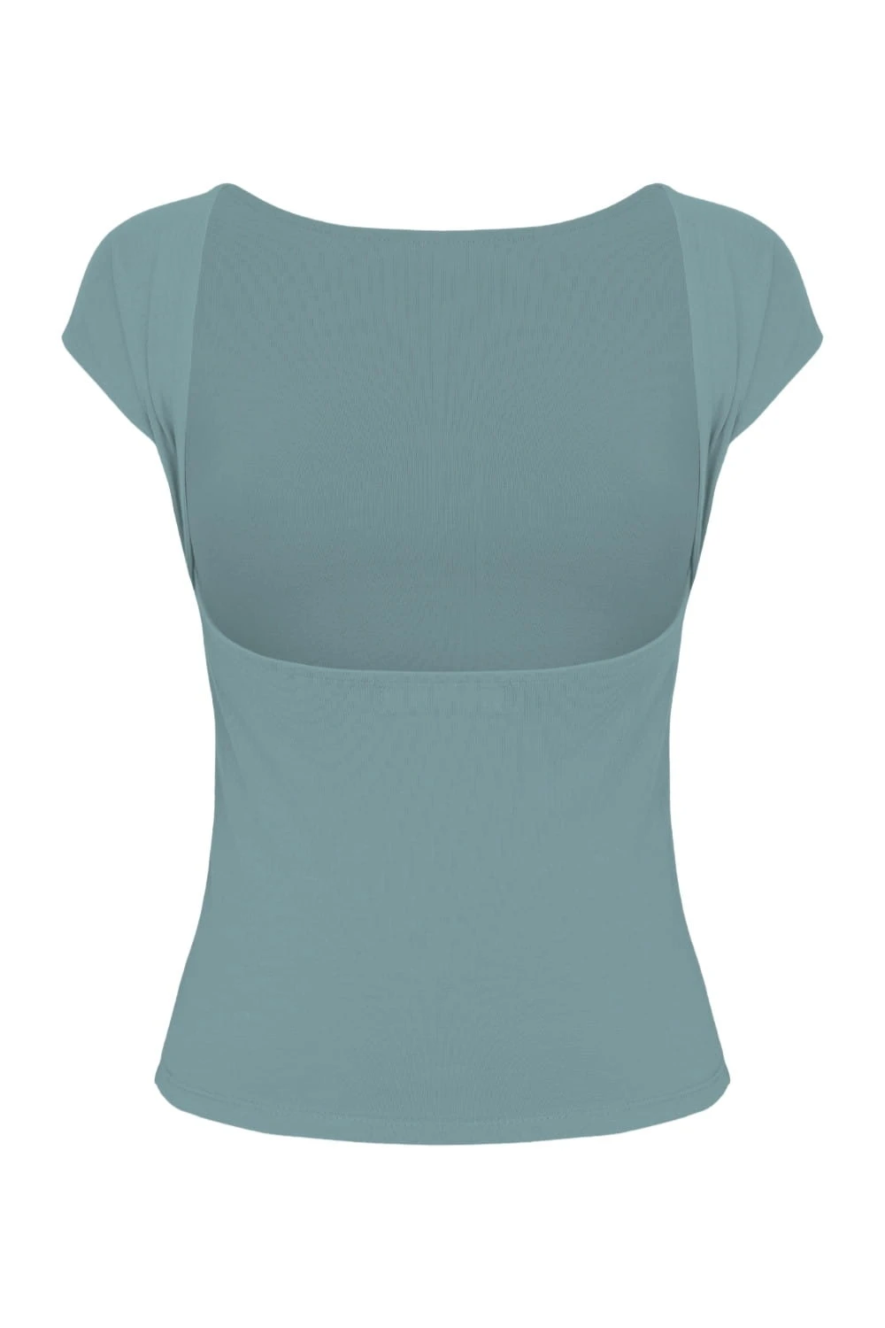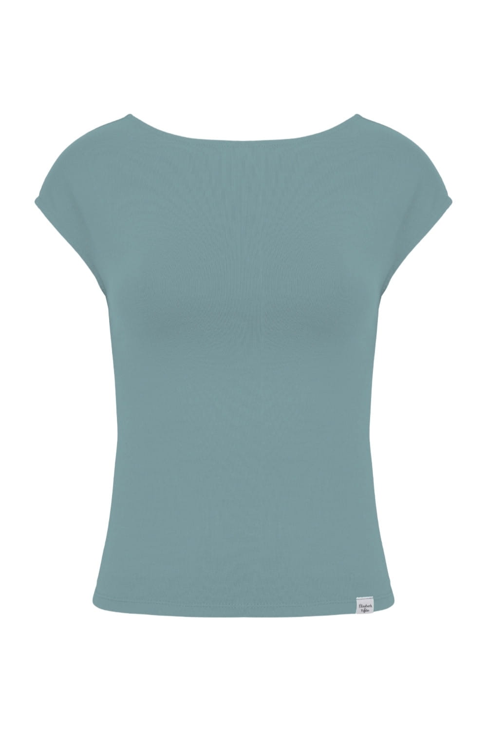 RHÉA - Smoke Blue - bawełniana taliowana bluzka z wycięciem na plecach i krótkimi rękawami