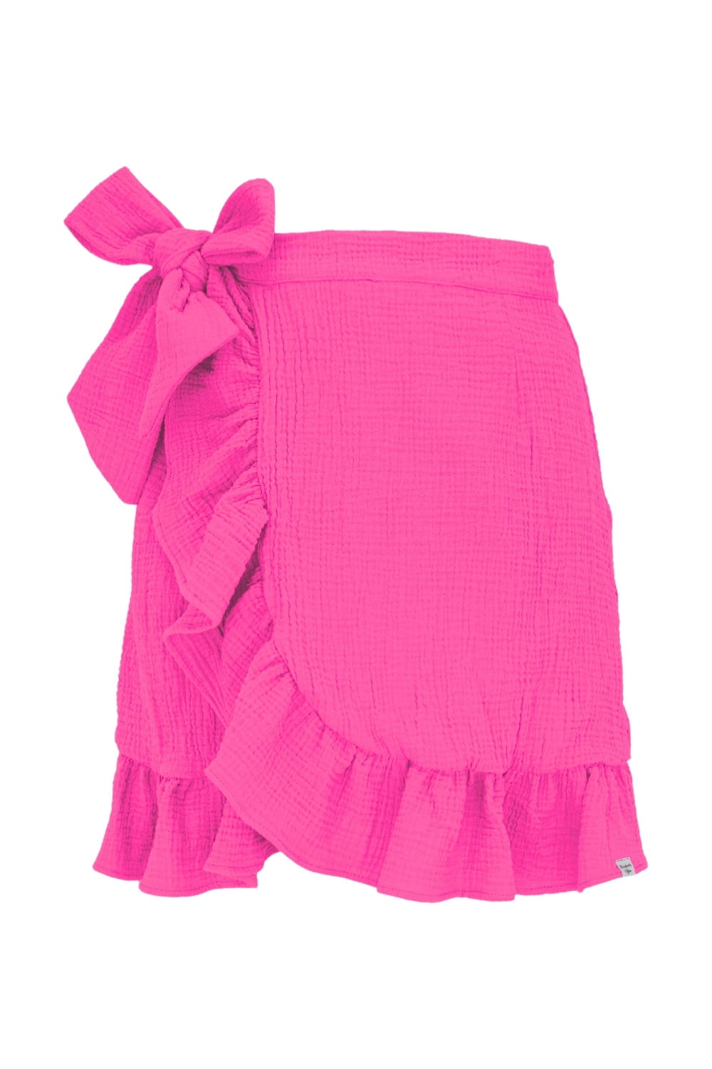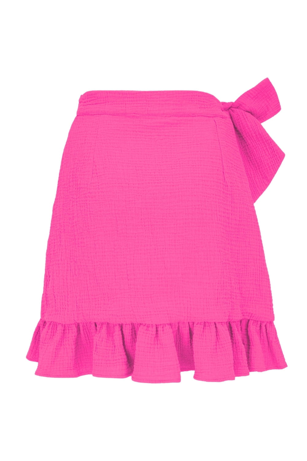 ROSALIA - Fuchsia Purple - kopertowa spódnica przed kolano z falbaną i wiązaniem w talii