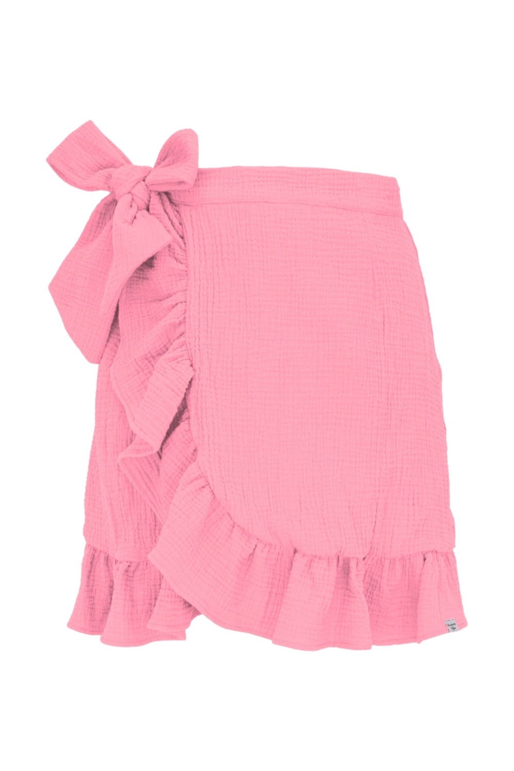 ROSALIA - Peony - kopertowa spódnica przed kolano z falbaną i wiązaniem w talii