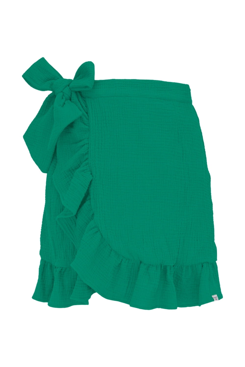 ROSALIA - Pepper Green - kopertowa spódnica przed kolano z falbaną i wiązaniem w talii