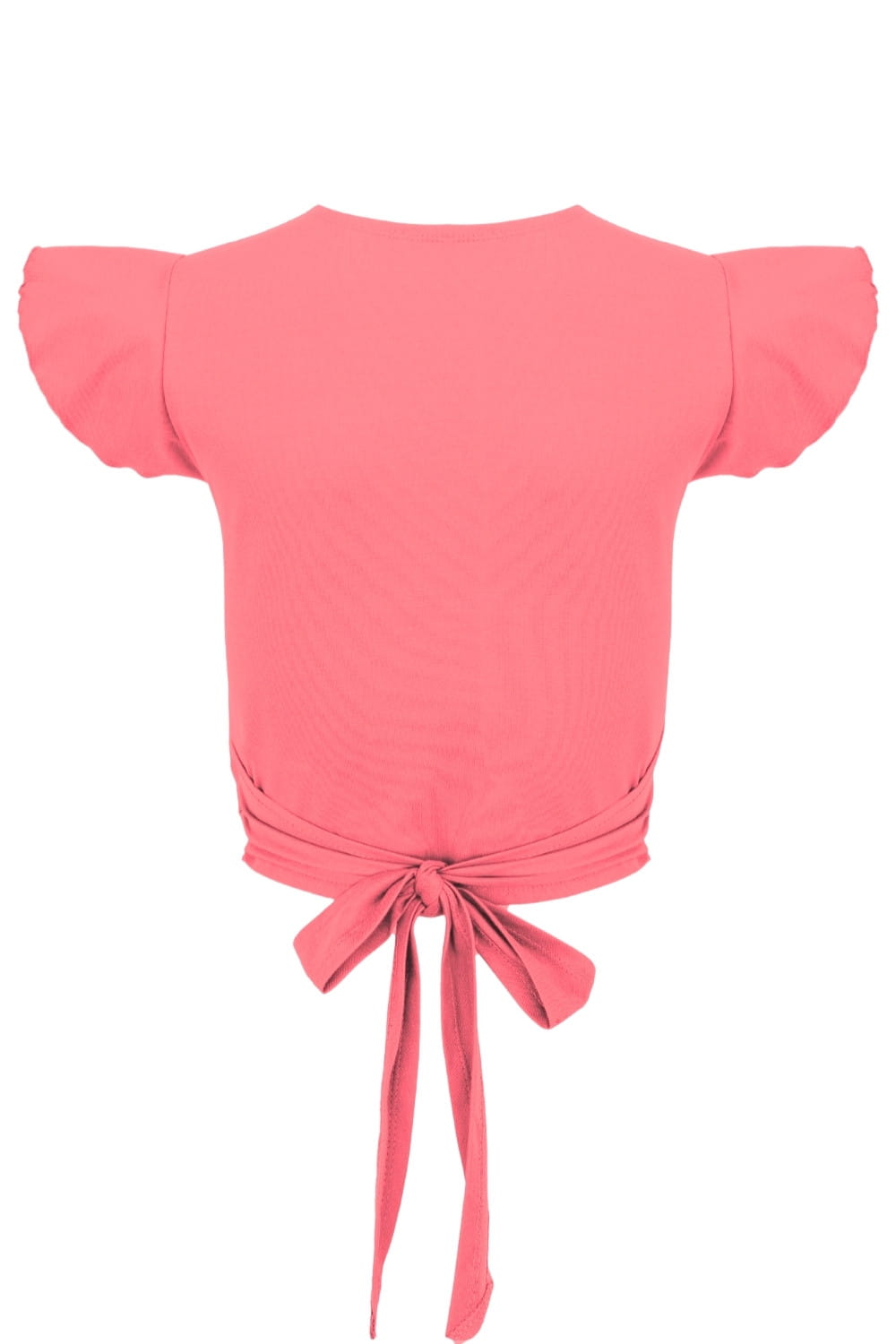 SOPHIÉ - Sunkist Coral - bawełniana kopertowa bluzka z wiązaniem i krótkimi zwiewnymi rękawami