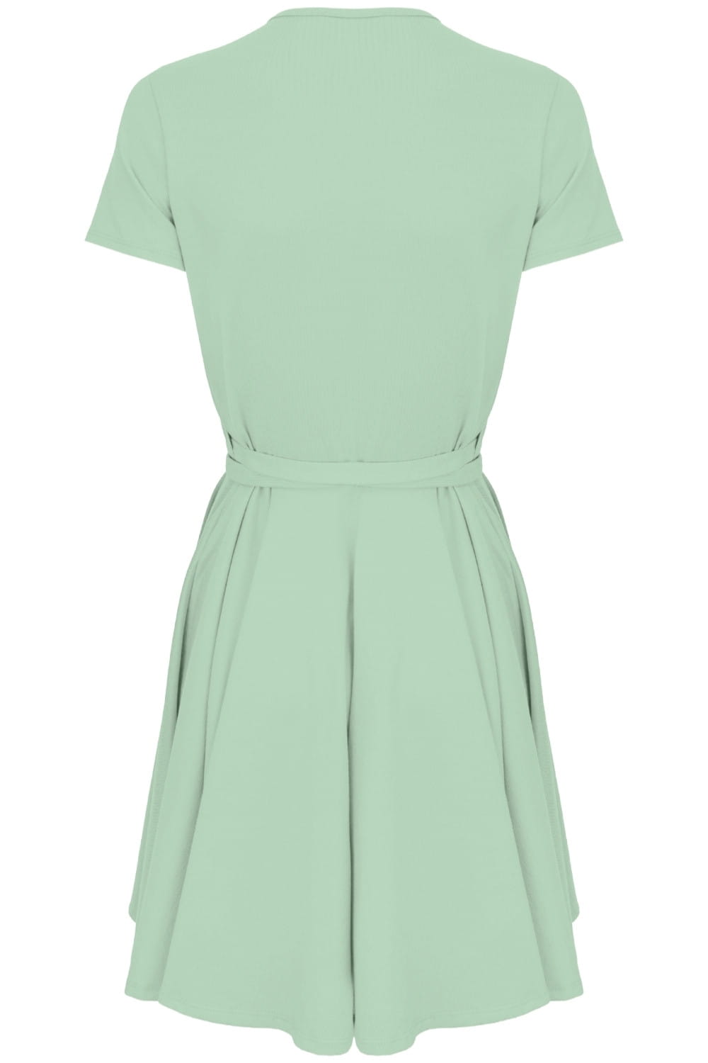 Dzianinowa sukienka przed kolano z kopertowym dekoltem i wiązanym paskiem w talii.