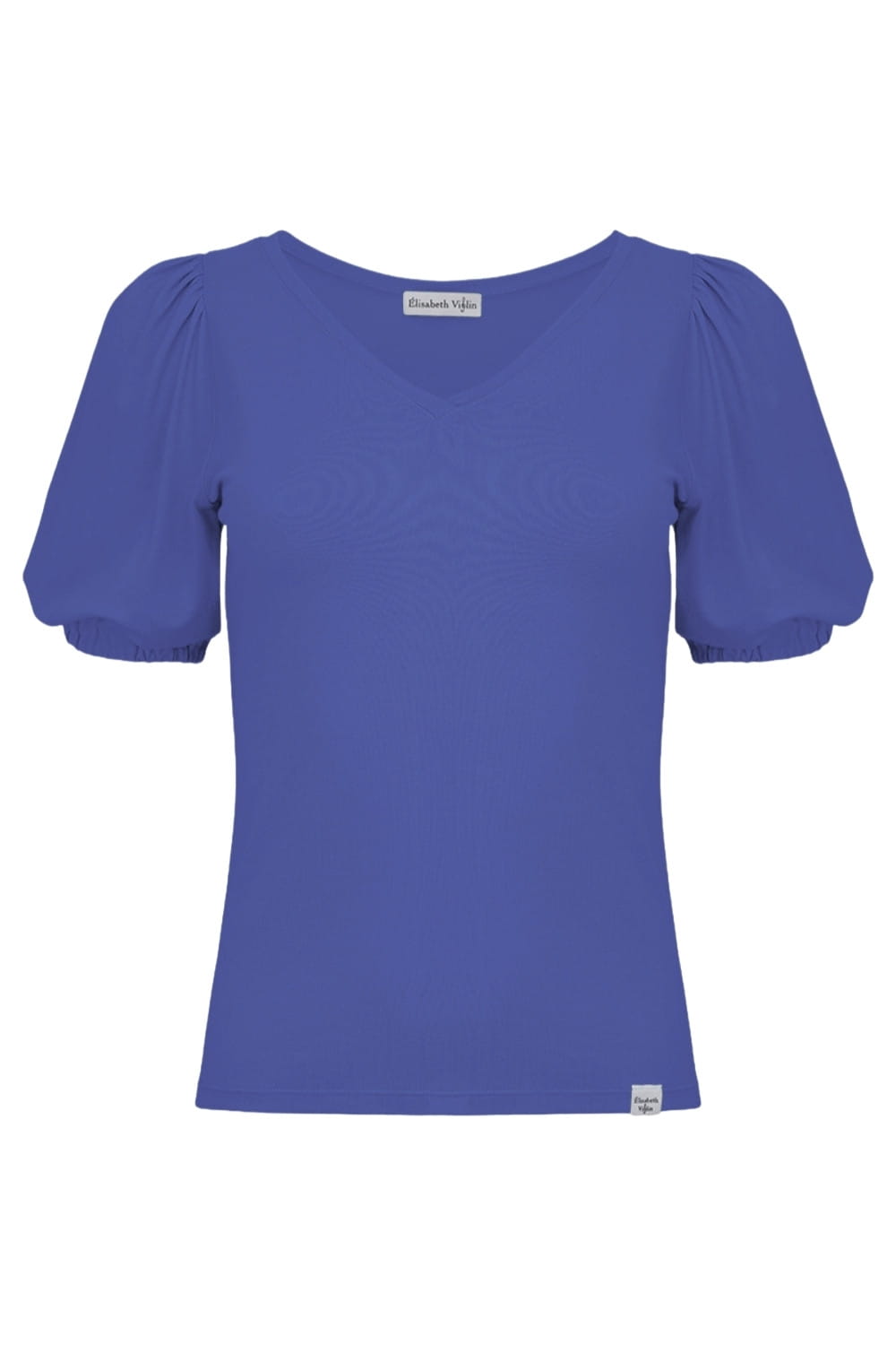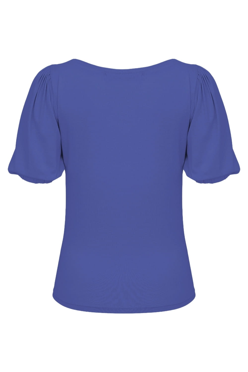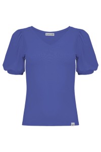 VIVA - Amparo Blue - wiskozowa taliowana bluzka z dekoltem w serek i krótkimi rękawami z bufkami zakończonymi gumką