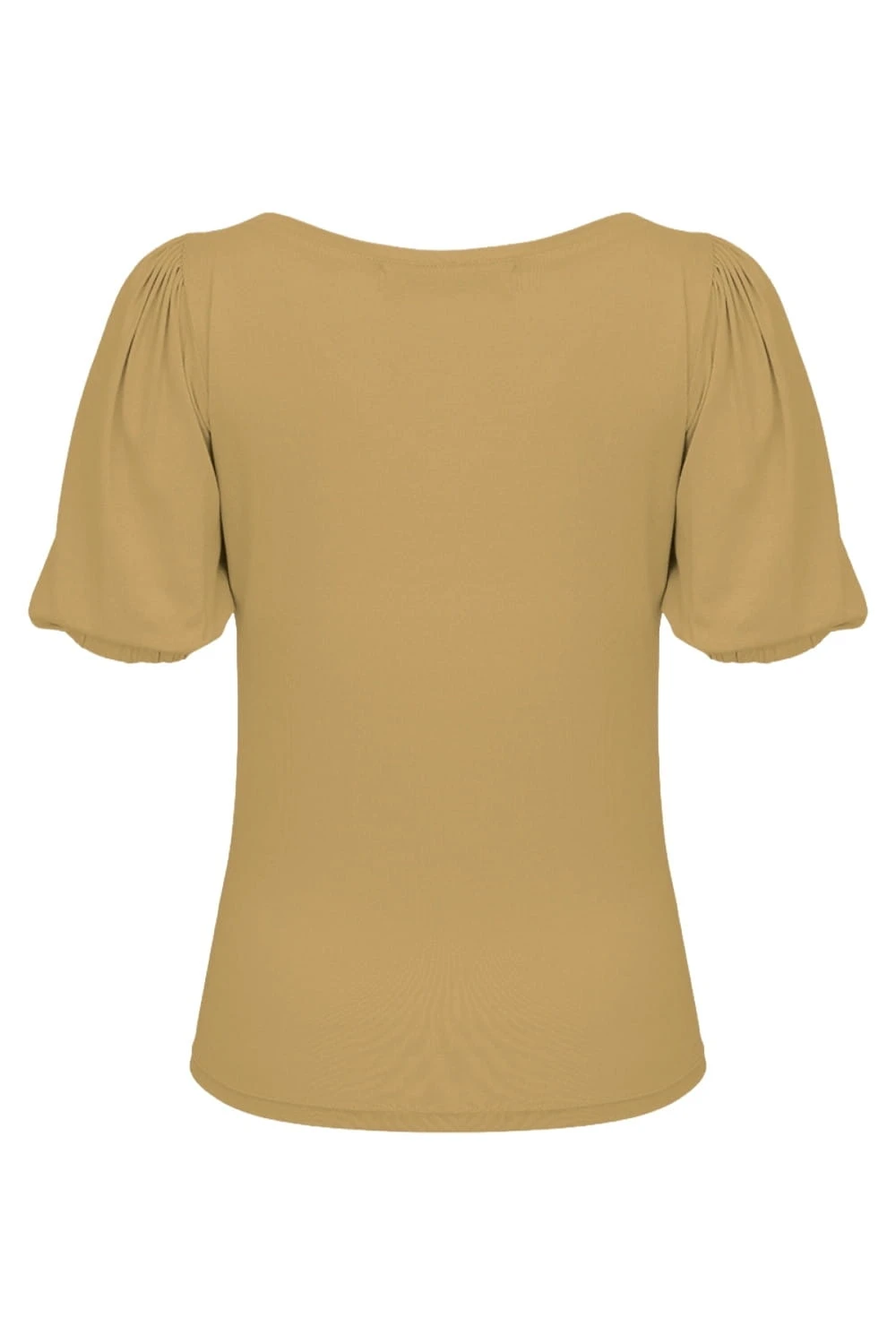 Zachwyca kobiecym dekoltem w kształcie litery „V” oraz subtelnie bufkami przy ramionach, które dodają sylwetce lekkości i romantyzmu. Dzięki elastycznej tkaninie doskonale dopasowuje się do ciała, zapewniając komfort noszenia przez cały dzień.
