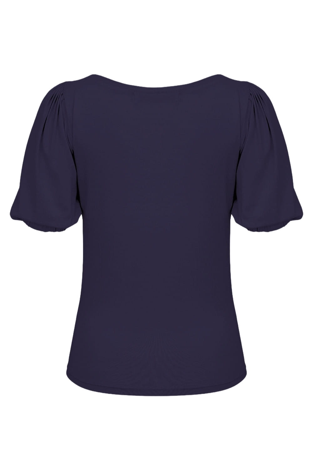 Zachwyca kobiecym dekoltem w kształcie litery „V” oraz subtelnie bufkami przy ramionach, które dodają sylwetce lekkości i romantyzmu. Dzięki elastycznej tkaninie doskonale dopasowuje się do ciała, zapewniając komfort noszenia przez cały dzień.